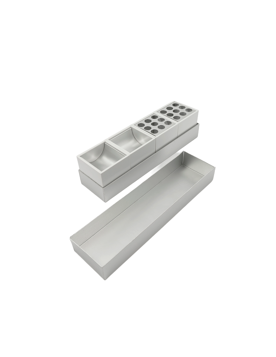 Danese MilanoCanarie è un set da scrivania composto da un portapenne, un porta fermagli e due posacenere pensato per organizzare un piano di lavoro essenziale per scrittura e disegno.