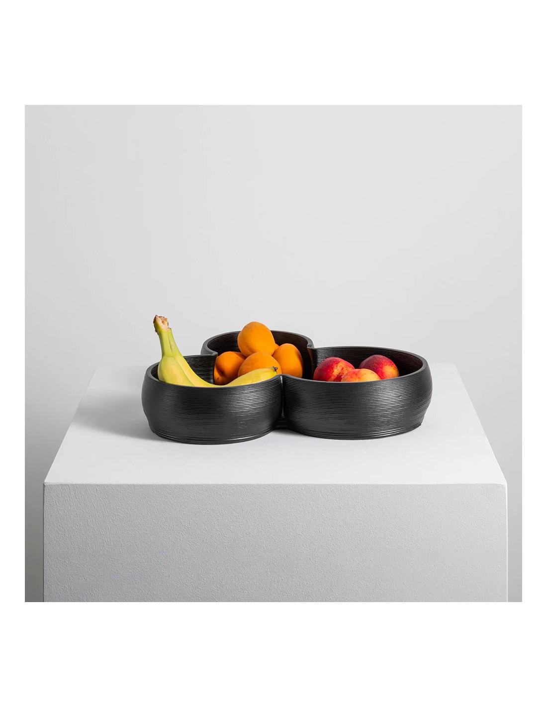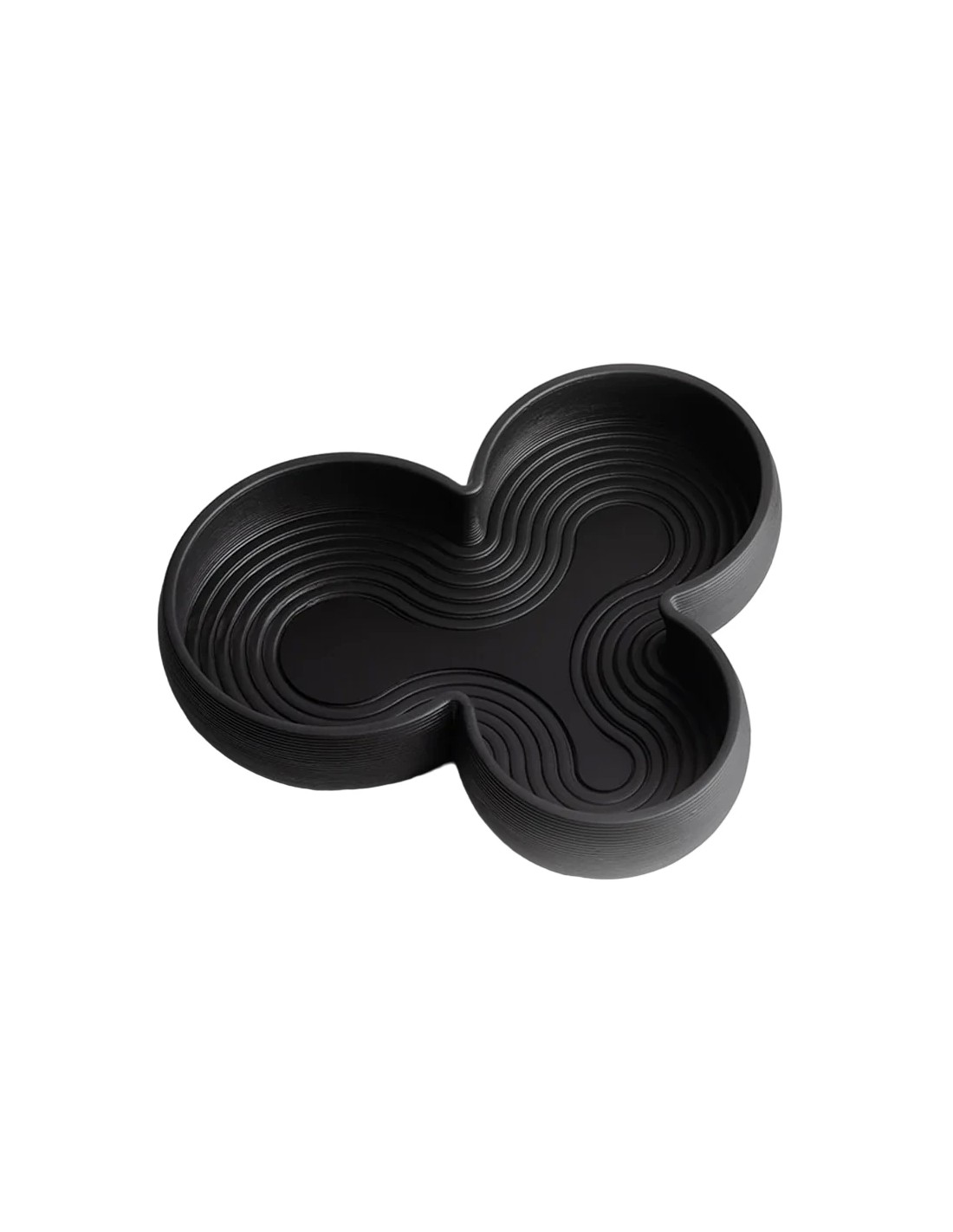 Centrotavola realizzato in stampa 3D in argilla, ispirato alle forme del piano ipogeo del Museo Etrusco Fondazione Luigi Rovati di Corso Venezia a Milano. La circolarità e la sovrapposizione dei tratti caratterizzanti il piano interrato del museo sono riproposte nei tratti sinuosi che caratterizzando MCV. La stampa 3D di argilla è una tecnologia innovativa e sperimentale per le difficoltà che comporta la creazione di volumi con materiali fluido densi: le forme nascono infatti strato su strato attraverso il processo LDM (Liquid Deposition Modeling). Una volta solidificato e cotta l'argilla viene poi sottoposta a finitura con un cristallino opaco nero che le conferisce il colore finale e protegge il materiale rendendolo adatto anche al contatto con i cibi.