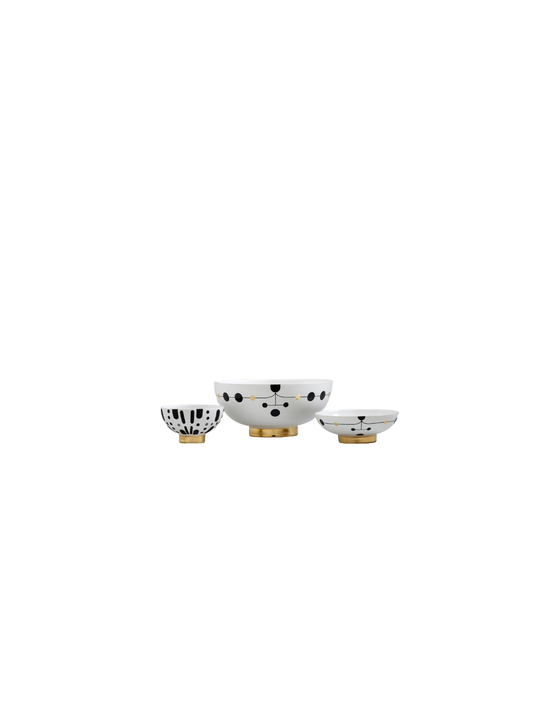 Collezione da tavola in grès e smalto bianco lucido, con decorazioni in nero e dettagli in oro 24 kt, applicate tramite un processo manuale e proposte in numerose varianti grafiche. Ciotole di 3 dimensioni diverse
