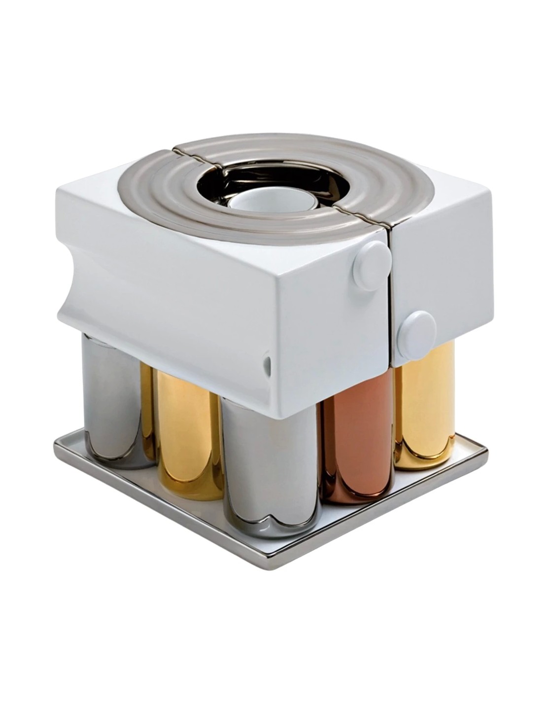 BosaScultura di Riccardo Schweizer, composta da due brocche e dieci bicchieri nei vari toni dei metalli preziosi. Un oggetto d'uso, pensato con un geniale incastro che una volta composto diventa una precisa figura geometrica. Set di Brocche e Bicchieri.