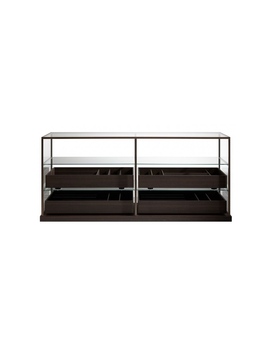 Ideale per la casa cosi come per i negozi piu eleganti, Acquario è la cassettiera centro-stanza in cristallo trasparente con profili in ottone brunito, suddivisa in 3 ripiani e attrezzata con vaschette in legno che lasciano a vista il contenuto, per riporlo in perfetto ordine ed estrarlo con facilità.