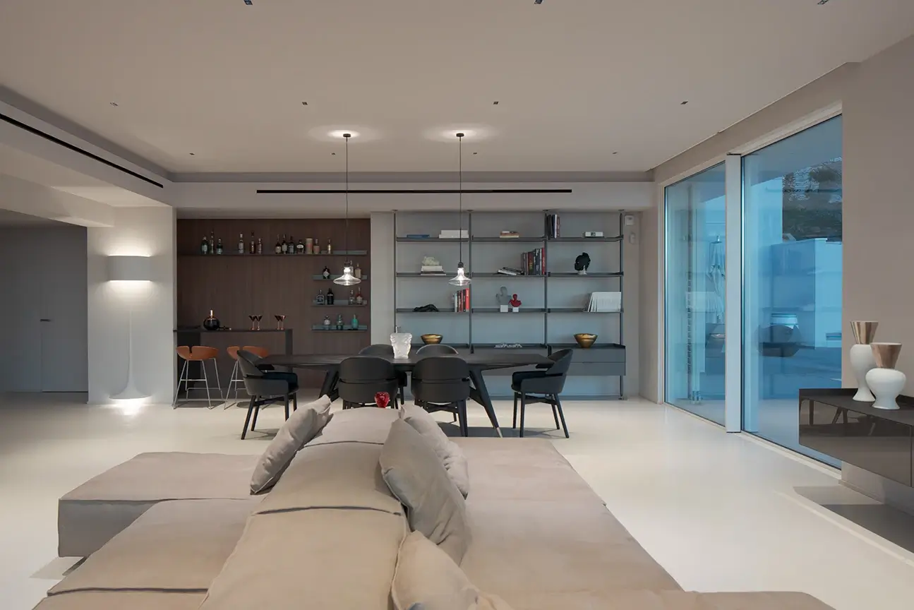 L'illuminazione è affidata alle lampade a sospensione di Viabizzuno, che diffondono una luce soffusa e accogliente, creando atmosfera e calore nell'ambiente circostante. Lungo una delle pareti, la presenza discreta ma potente delle pareti Rimadesio aggiunge un tocco di modernità e minimalismo allo spazio.