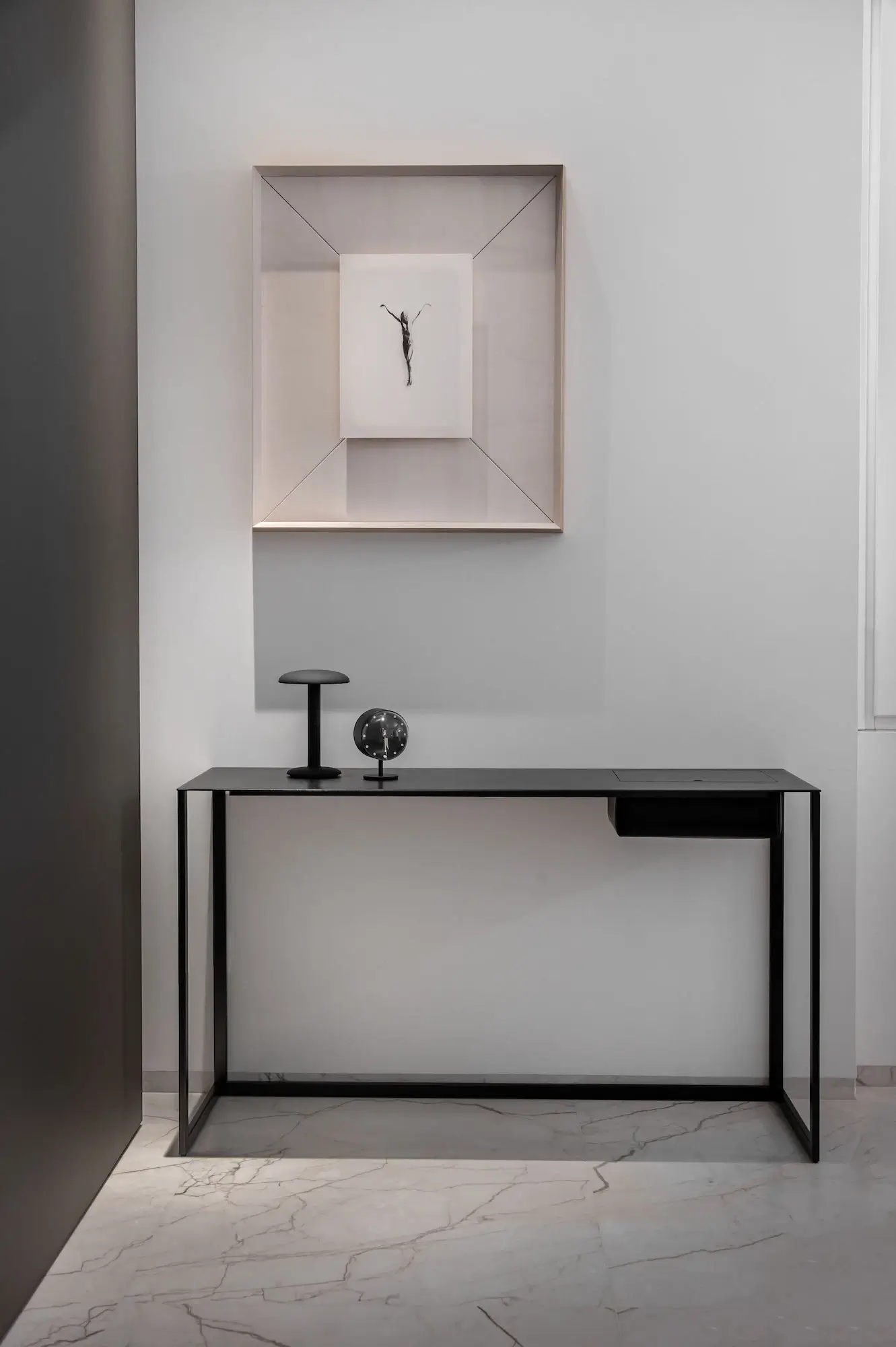 Al centro dell'ambiente, lo scrittoio Calamo di Zanotta, progettato con maestria da Gabriele Rosa, con le sue linee pulite e il suo design elegante.