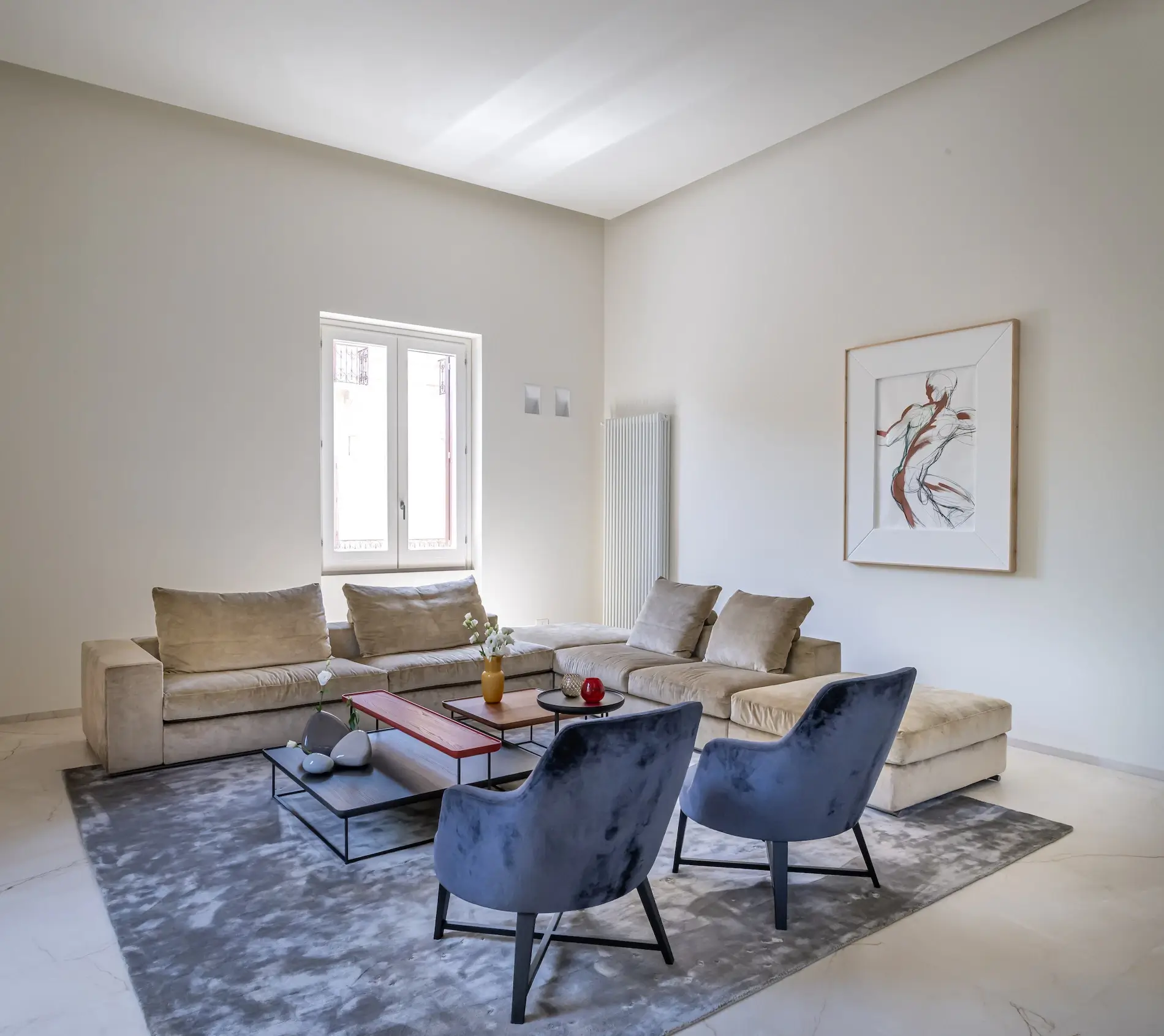 Ad impreziosire lo spazio un tappeto artigianale Amini, mentre il vaso Opalino di Venini aggiunge un tocco di colore.