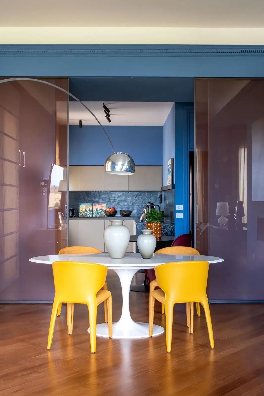 Intorno al tavolo si trovano le sedie Hola di Cassina, progettate da Hannes Wettstein. Con le loro linee pulite e la silhouette elegante, queste sedie aggiungono un tocco di raffinatezza e stile allo spazio.