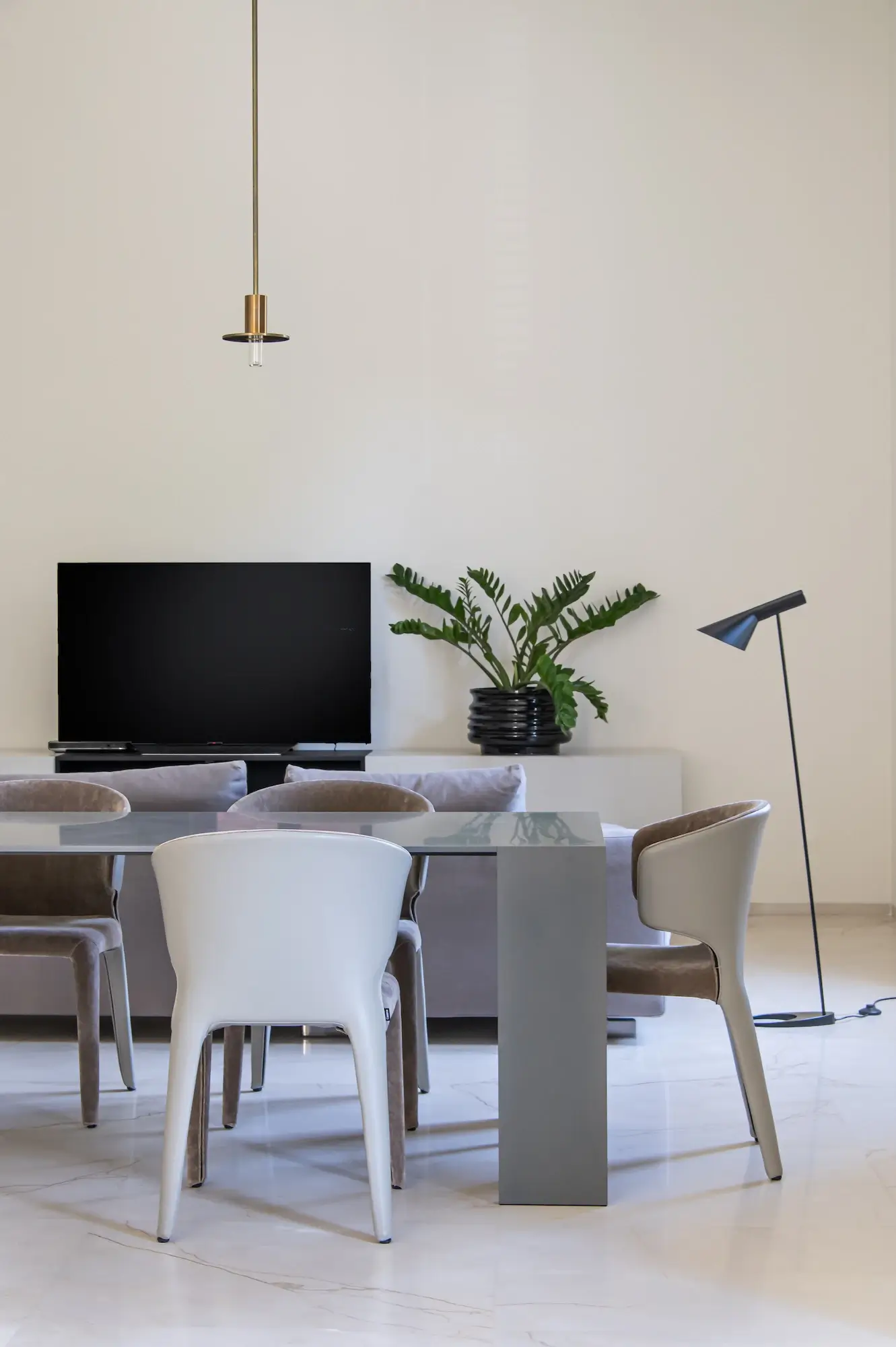 Intorno al tavolo, le sedie Hola 367 di Cassina, ideate da Hannes Wettstein, aggiungono un tocco di sofisticatezza. Con le loro linee pulite e il comfort, queste sedie trasudano classe e raffinatezza.
