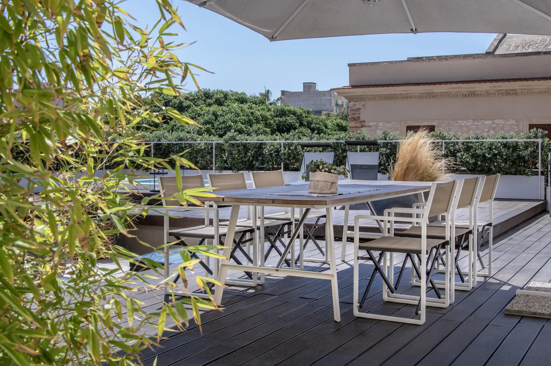 Al centro di questo spazio all'aperto si trova il tavolo Pier di Roda, progettato con maestria da Rodolfo Dordoni. La sua struttura elegante e minimalista si sposa perfettamente con l'ambiente circostante.