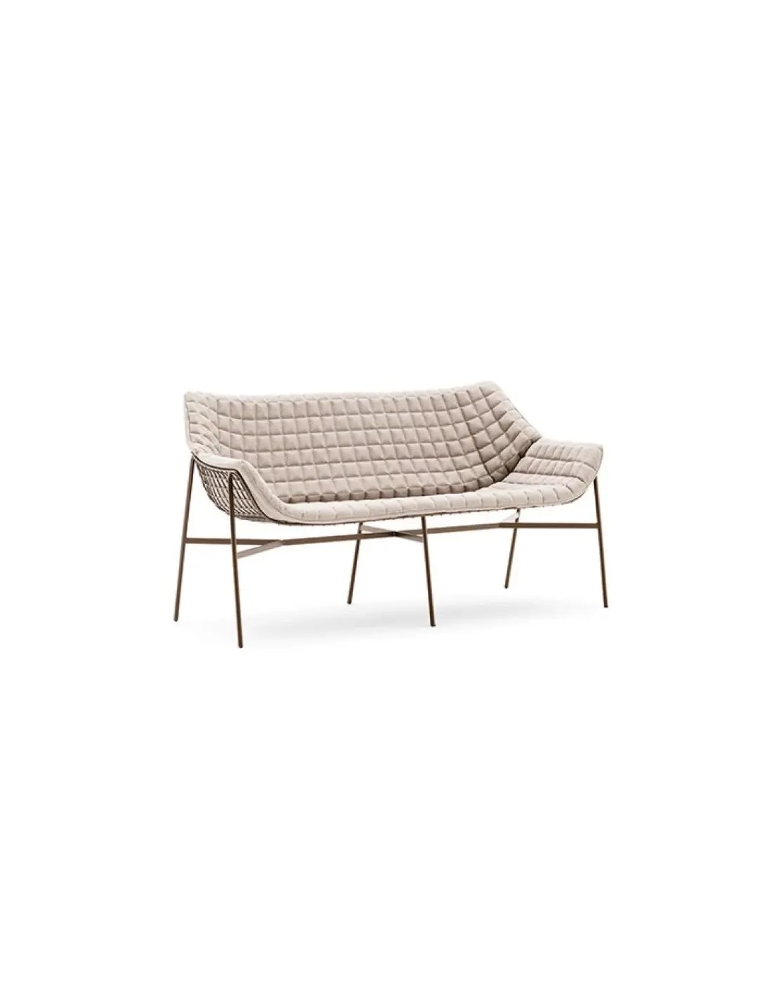 Il particolare intreccio in tondino di metallo che distingue la collezione Summer Set trova nel divano a due posti la sua massima espressione. Il design di questa seduta unisce eleganza e comfort in un'inedita sintesi che fa della leggerezza una delle sue caratteristiche più spiccate.