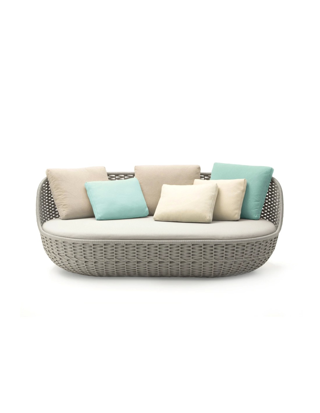 Divano due posti. La serie Orbitry comprende anche una seduta girevole disponibile in due dimensioni e una seduta sospesa. Cuscino di seduta: removibile, in fibra di poliestere, inserto in poliuretano indeformabile, fodera fissa in poliestere idrorepellente. Rivestimento cuscino di seduta: sfoderabile e disponibile nei tessuti Luz, Rope T, Brio, Thea o Wara. Per garantire maggior comfort, è necessario l'utilizzo di cuscini di appoggio. Cuscini di appoggio: removibili, in fibra di poliestere, fodera fissa in poliestere idrorepellente. Rivestimento cuscini di appoggio: sfoderabile e disponibile nei tessuti Luz, Rope T, Brio o Thea.