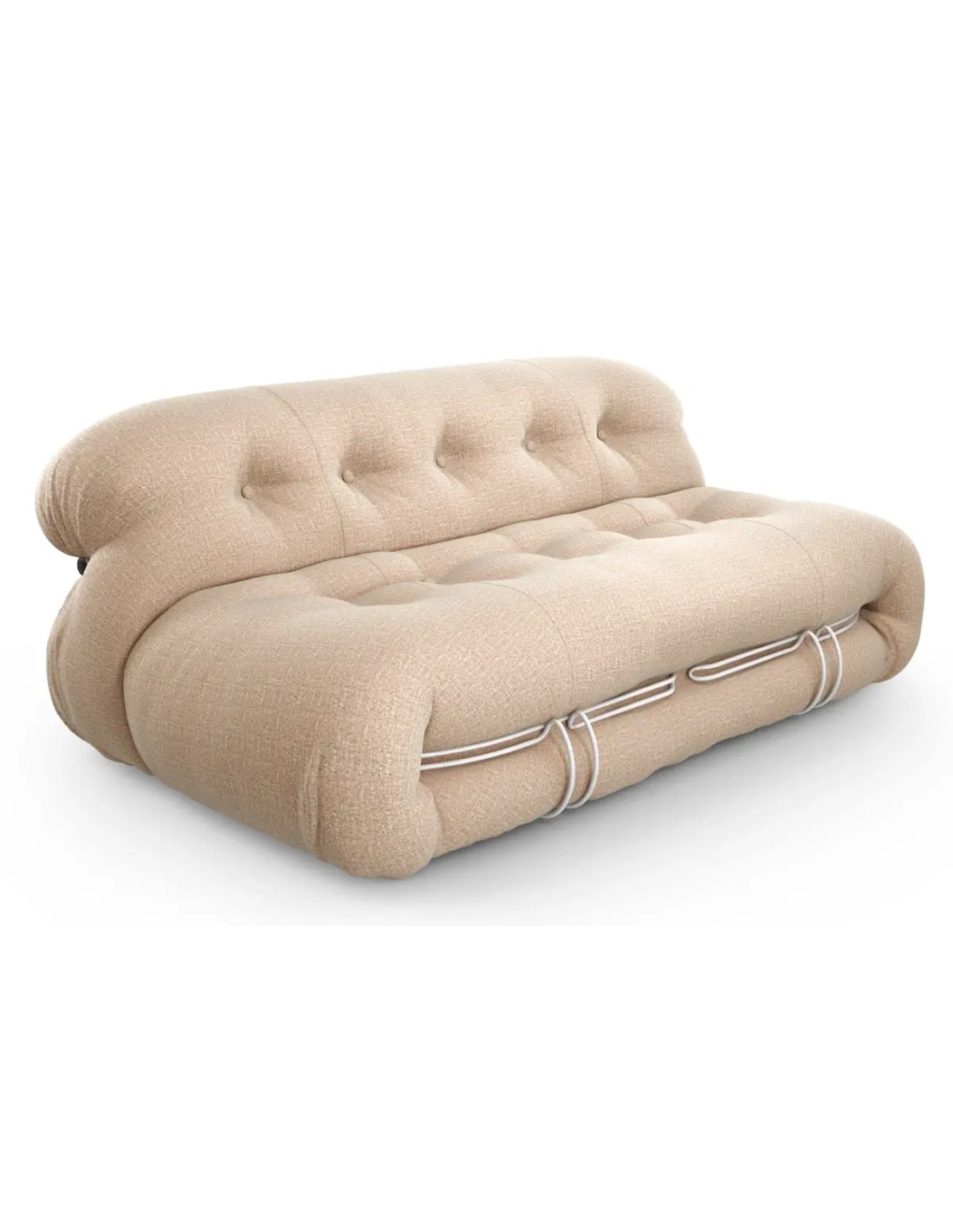 Il piano è costituito da 19 listelli in legno e sollevato su piedini; i cuscini della seduta del divano e quelli dello schienale possono essere posizionati in qualsiasi punto della struttura con un semplice sistema di fissaggio.