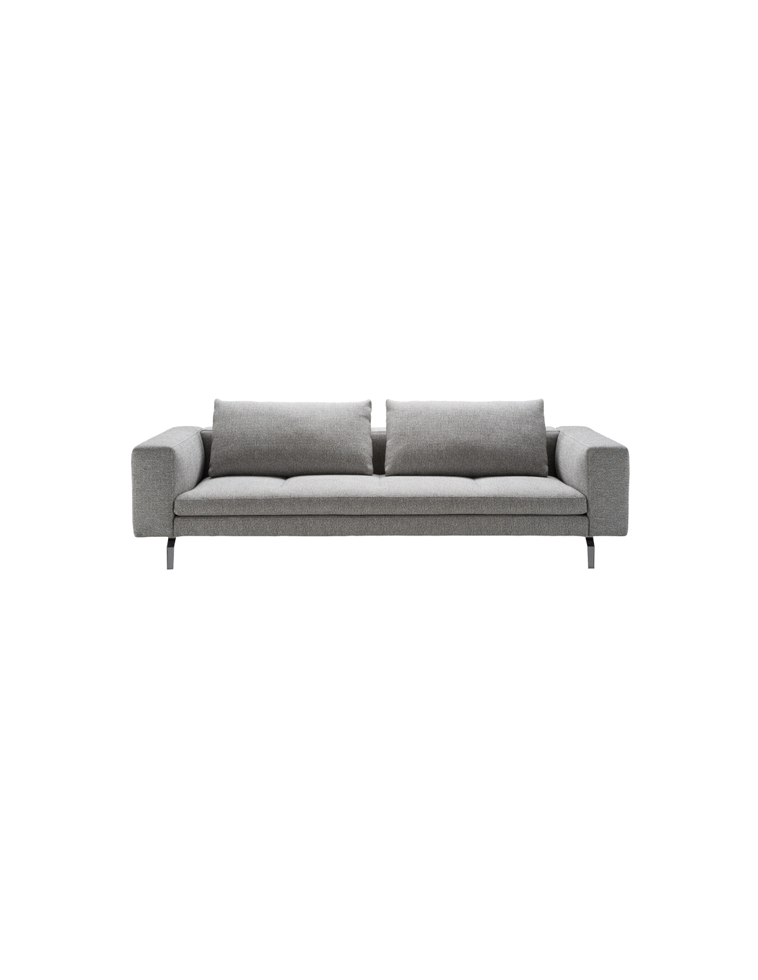Bruce di Zanotta - Divani monoblocco e componibili, pouf. Lega di alluminio lucido, o con finitura nichel-satinata naturale o nera, o verniciata nera. Struttura in acciaio. Sospensione di strisce elastiche. Rivestimento in poliuretano graduato/ Dacron Du Pont. Cuscino seduta in poliuretano/DacronDu Pont. Cuscini schienale e bracciolo in piuma d'oca. Rivestimento in cuscino a forma di rotolo in poliuretano/fibra di poliestere termolegata. Rivestimento sfoderabile in tessuto o pelle.