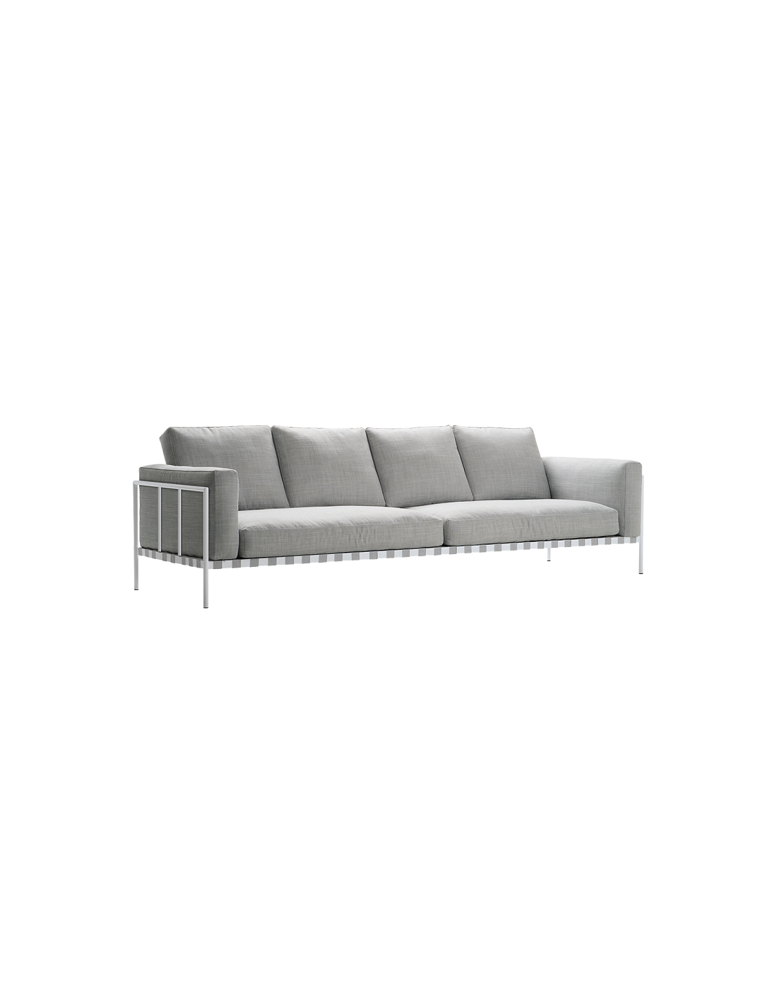 Divani monoblocco e pouf per uso esterno. Struttura portante in acciaio verniciato per esterno nella tonalità del bianco o del nero. Sospensione di strisce elastiche. Cuscino seduta, schienale e bracciolo in polietere reticolato a cellule aperte/Paineira, fibra vegetale idrorepellente. Rivestimento sfoderabile in tessuto Talasso.