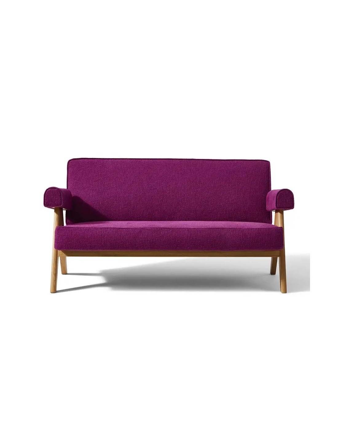 Capitol Complex Sofa è il divanetto progettato da Pierre Jeanneret con un’iconica struttura in legno a forma di ‘V’ rovesciata, rivestito in pelle o in tessuto.