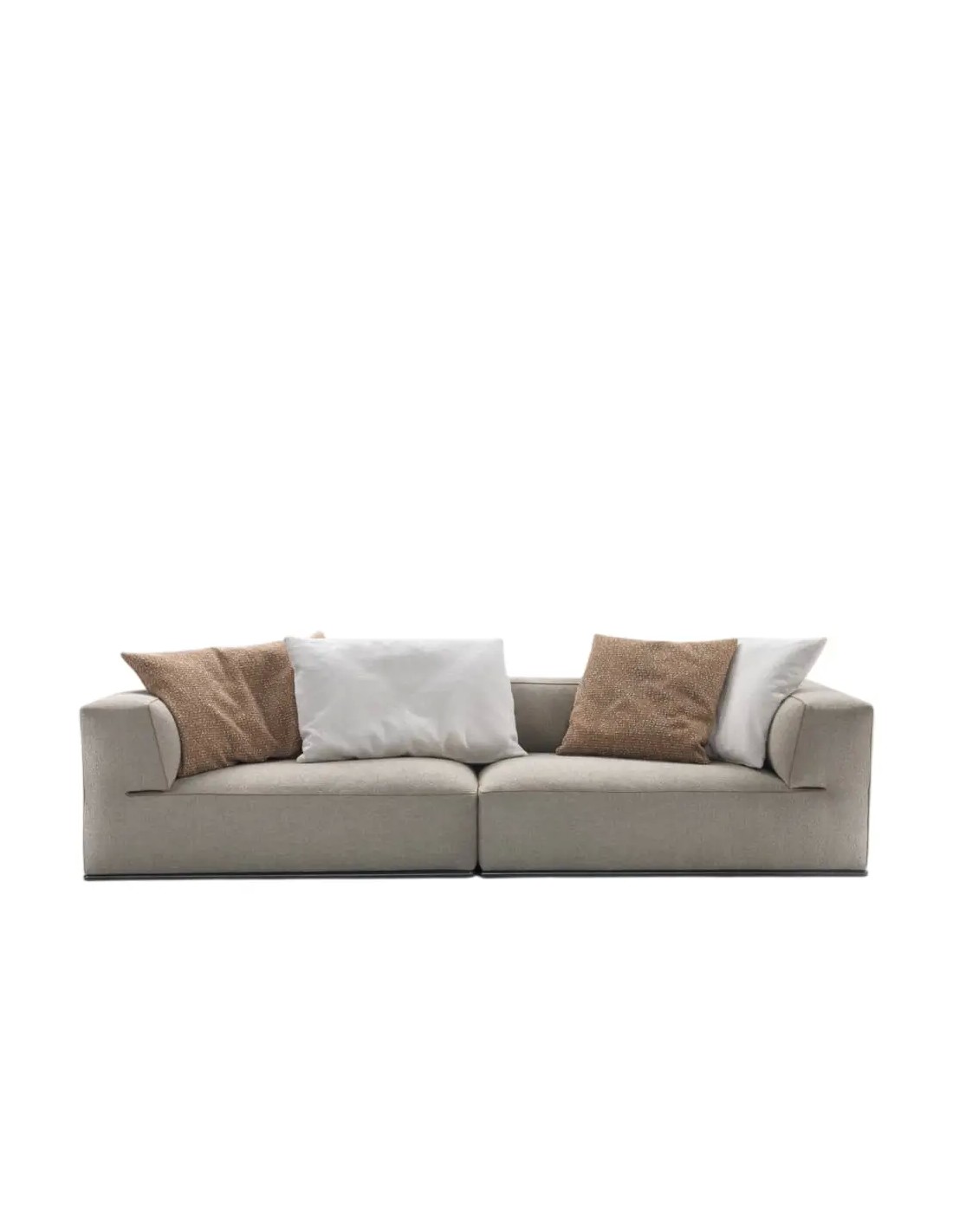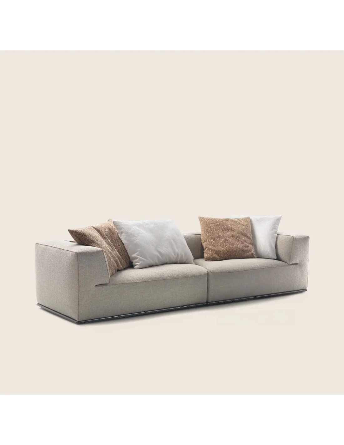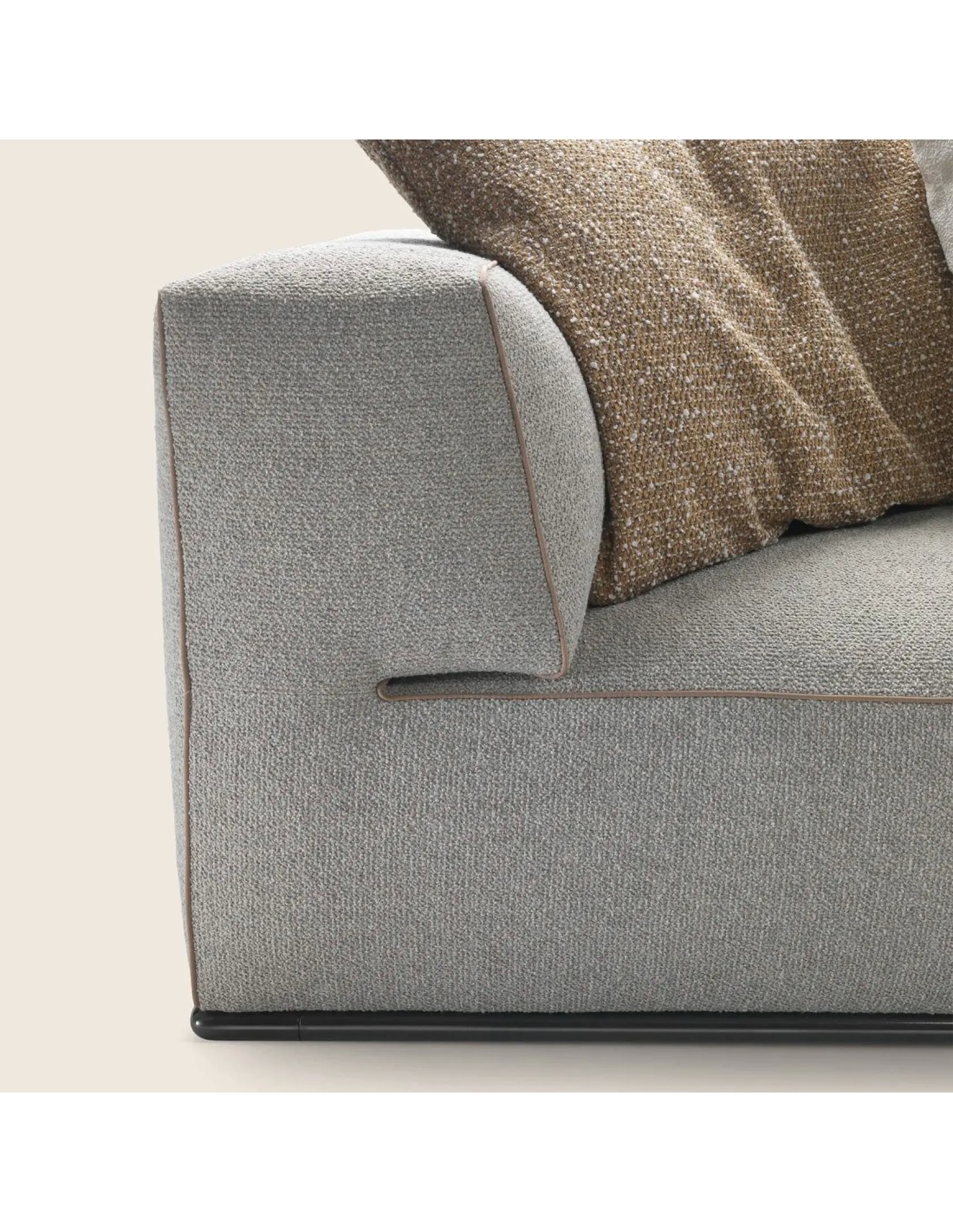 Ogni elemento del Perry è sollevato da terra tramite una struttura in metallo arretrata, che rimane quasi invisibile allo sguardo. Questo dettaglio tecnico conferisce al divano un aspetto leggero e arioso, nonostante le dimensioni generose e l'imbottitura ricca che invita al relax immediato.