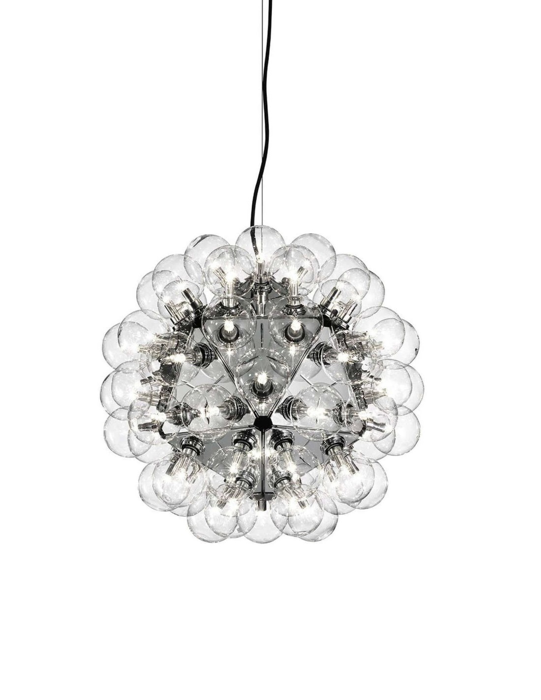 Apparecchio di illuminazione a sospensione a luce diretta e riflessa. Struttura composta da 20 triangoli in alluminio lucidato stampato. 60 lampadine Globolux chiare, alloggiano attorno alla struttura. Attacco a soffitto e rosone di acciaio.