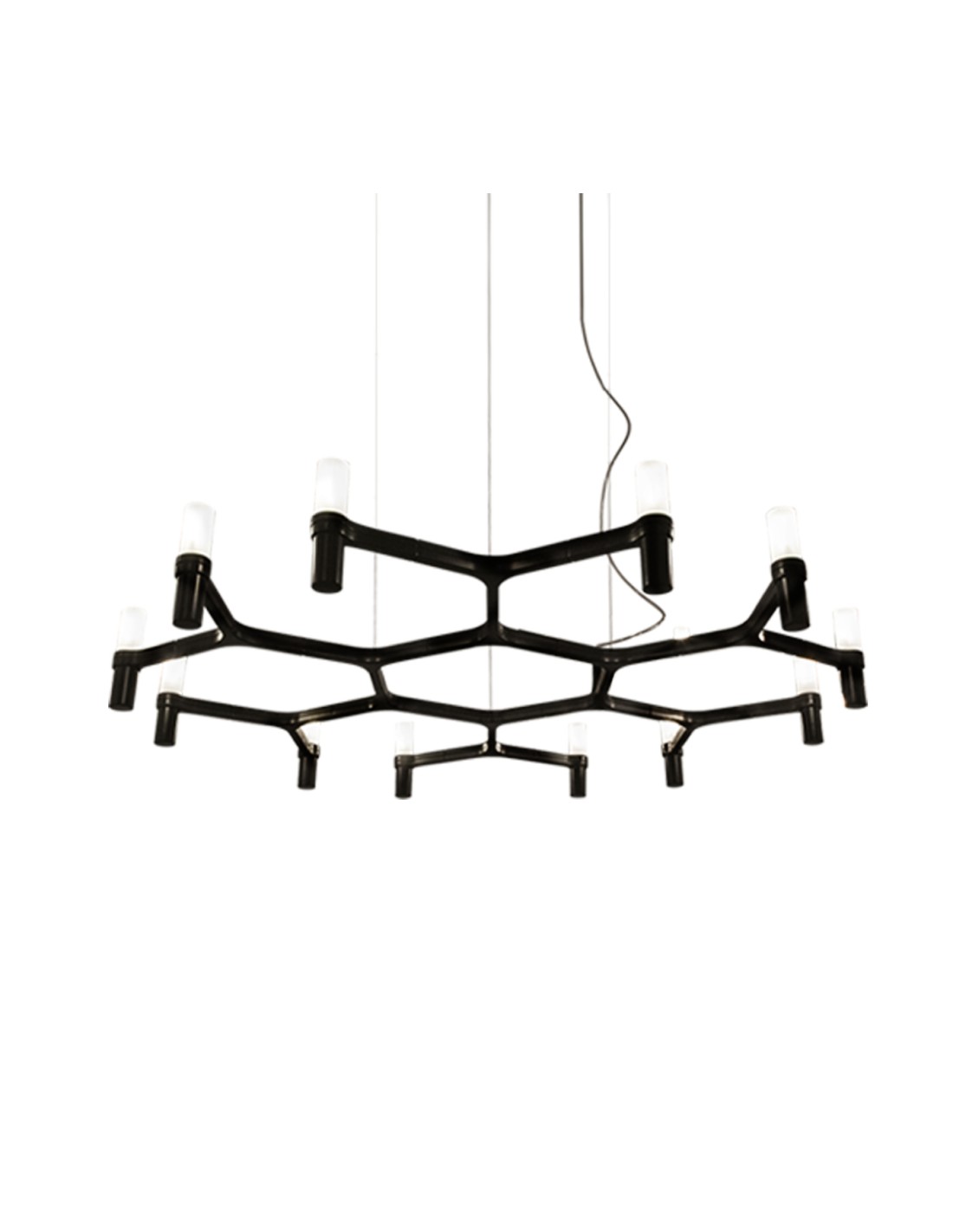 NemoFamiglia di chandelier a sospensione la cui forma si ispira alla sagoma del cristallo di neve. Lampade modulari realizzate con una struttura in alluminio pressofuso e bicchierini diffusori in vetro sabbiato o su richiesta vetro trasparente rigato.
