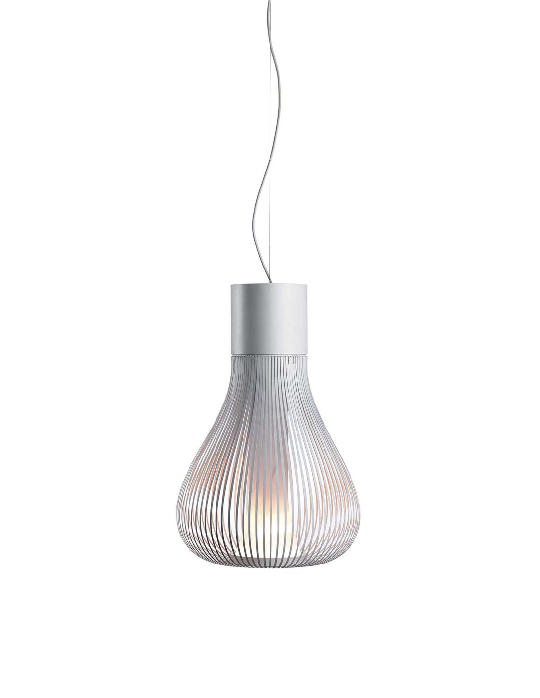 Apparecchio di illuminazione a sospensione a luce diffusa. Il corpo è costituito da una lastra fotoincisa chimicamente in acciaio inox e diffusore in borosilicato. Verniciatura a liquido. Base in alluminio pressofuso, rosone in poliammide caricata con il 30% di fibra di vetro ed attaccato a plafone di acciaio stampato e zincato. Cavo di sospensione in acciaio, cavo elettrico rivestito in FEP/PVC dello stesso colore dell'apparecchio.