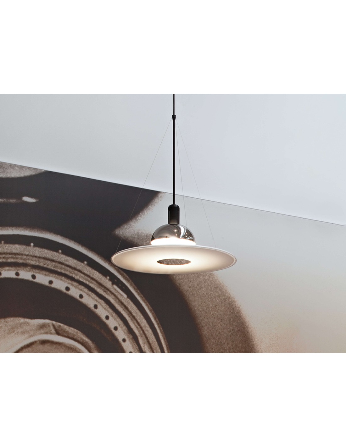 Il design unico combina un disco in metacrilato opalino sospeso con una struttura metallica essenziale. Il diffusore, che ricorda la forma di un frisbee, crea un suggestivo gioco di luci dirette e riflesse, generando un'illuminazione avvolgente e piacevole.