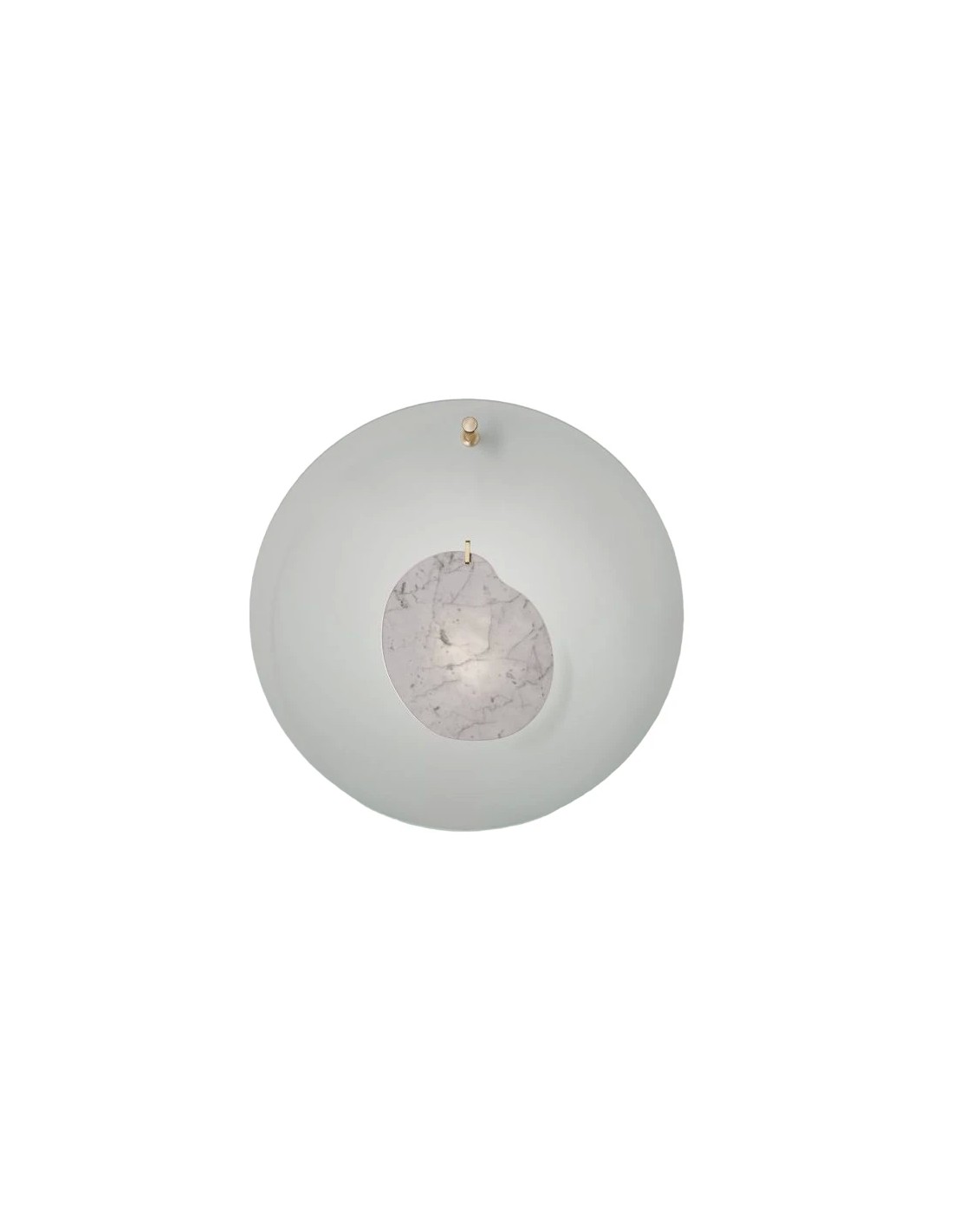Gioia è un gioiello pensato per adornare lo spazio domestico. La magia sta nella composizione: un elemento in marmo statuario è collocato al centro di un disco trasparente - i due elementi, liberi di muoversi, ricordano il ritmo oscillante di un pendente o di un orecchino.