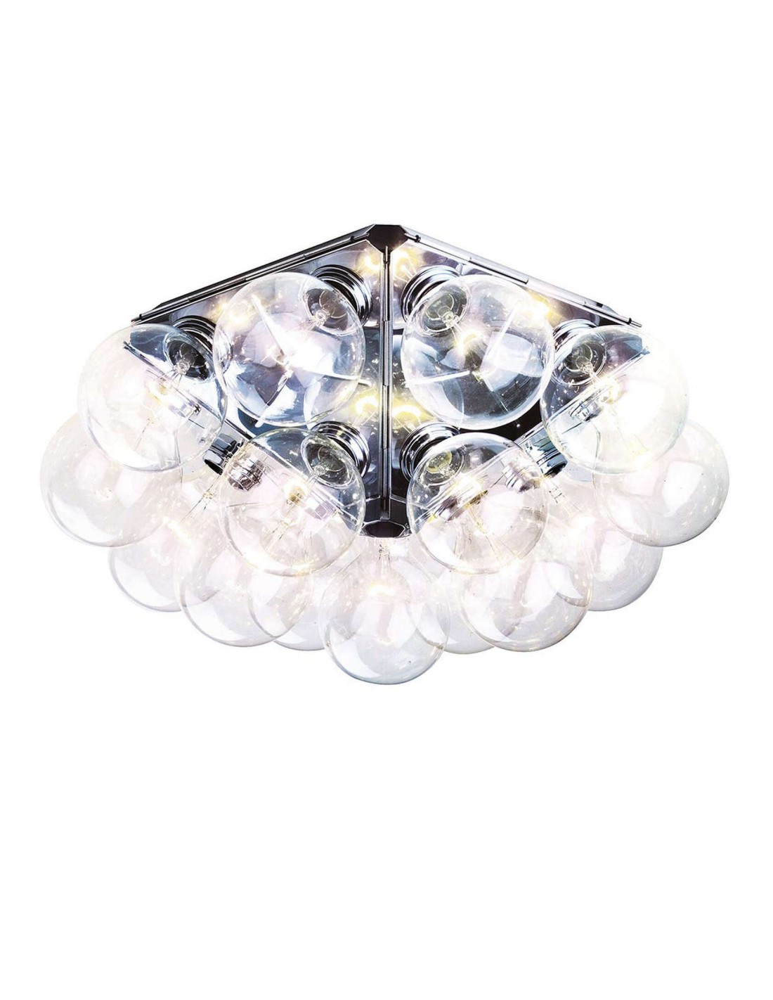 Apparecchio di illuminazione da parete/soffitto a luce diretta e riflessa. Struttura composta di 5 triangoli in alluminio lucidato stampato. 15 lampadine Globolux chiare, alloggiano attorno alla struttura. Attacco a parete/ soffitto e rosone di acciaio.