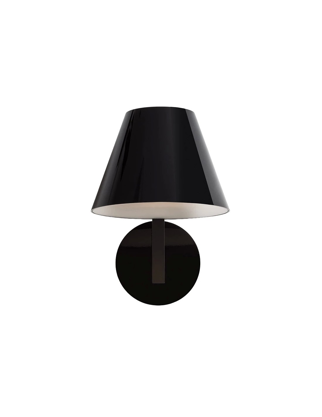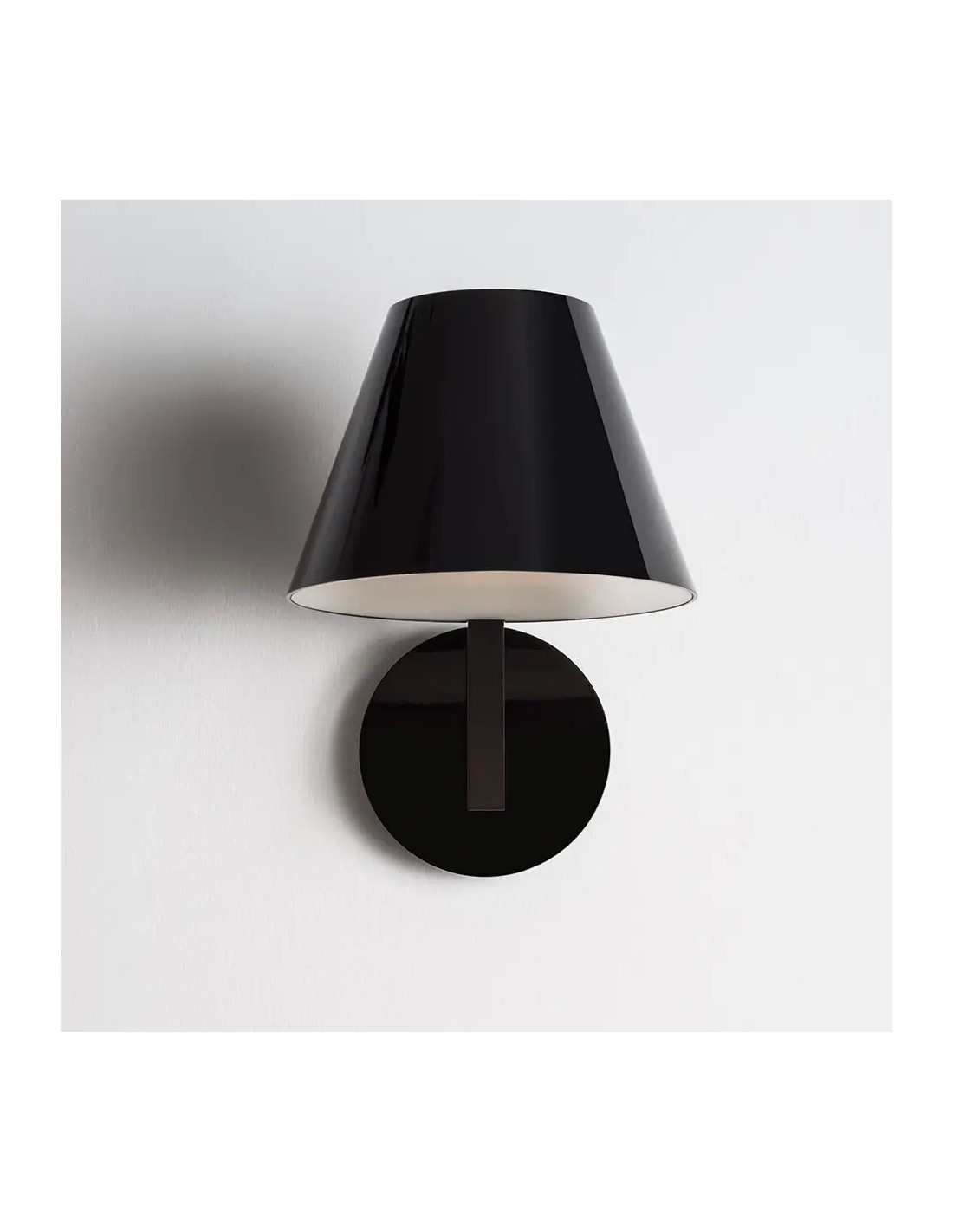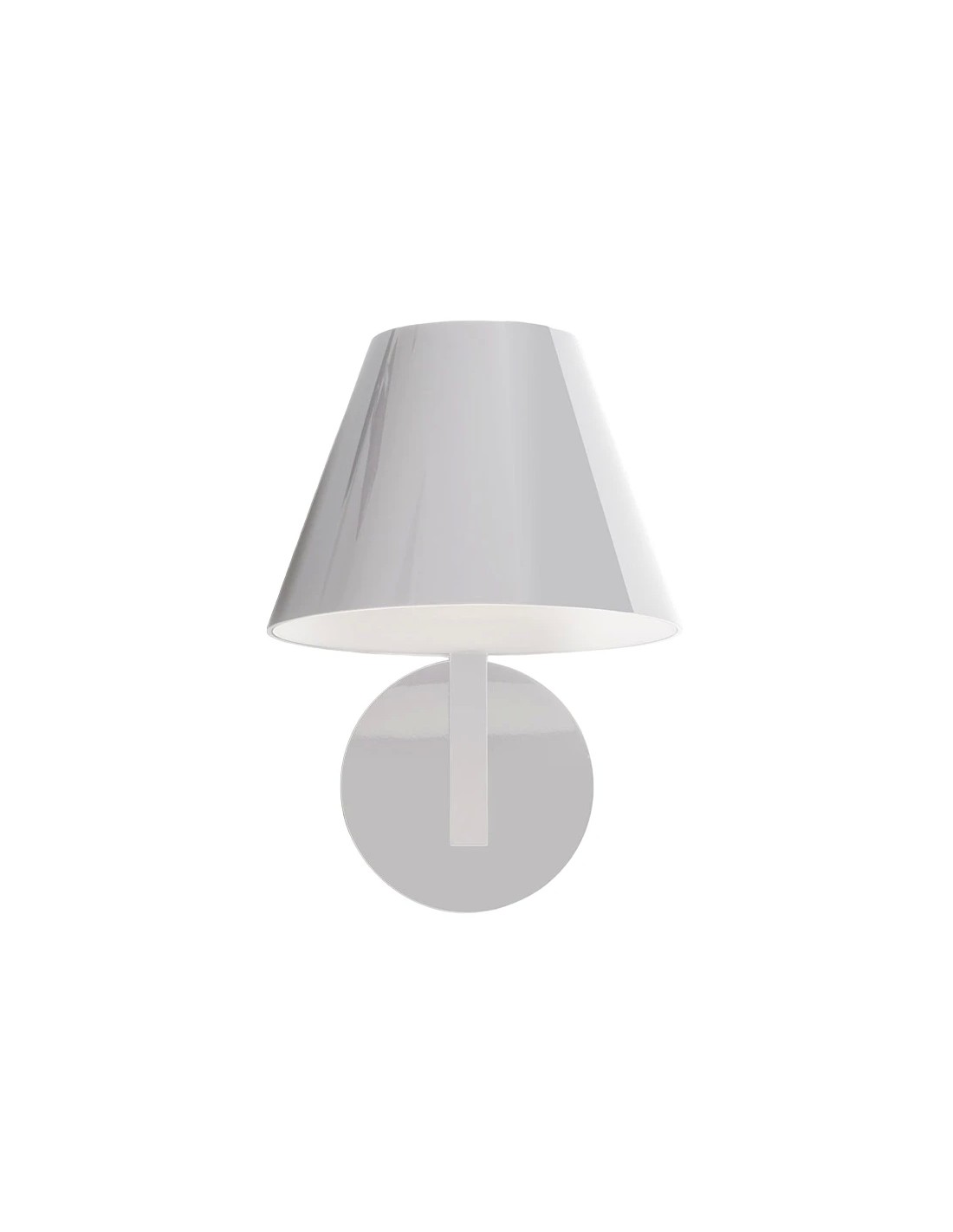 Nella versione a parete, La Petite di Artemide esalta ulteriormente il concetto di sospensione. I designer Andrea Quaglio e Manuela Simonelli hanno ridotto la struttura all'essenziale: uno stelo sottile in alluminio che si stacca dalla parete con un'inclinazione studiata per sorreggere il paralume in policarbonato. È una lampada da parete che non occupa spazio visivo, ma definisce l'ambiente con una presenza scultorea.