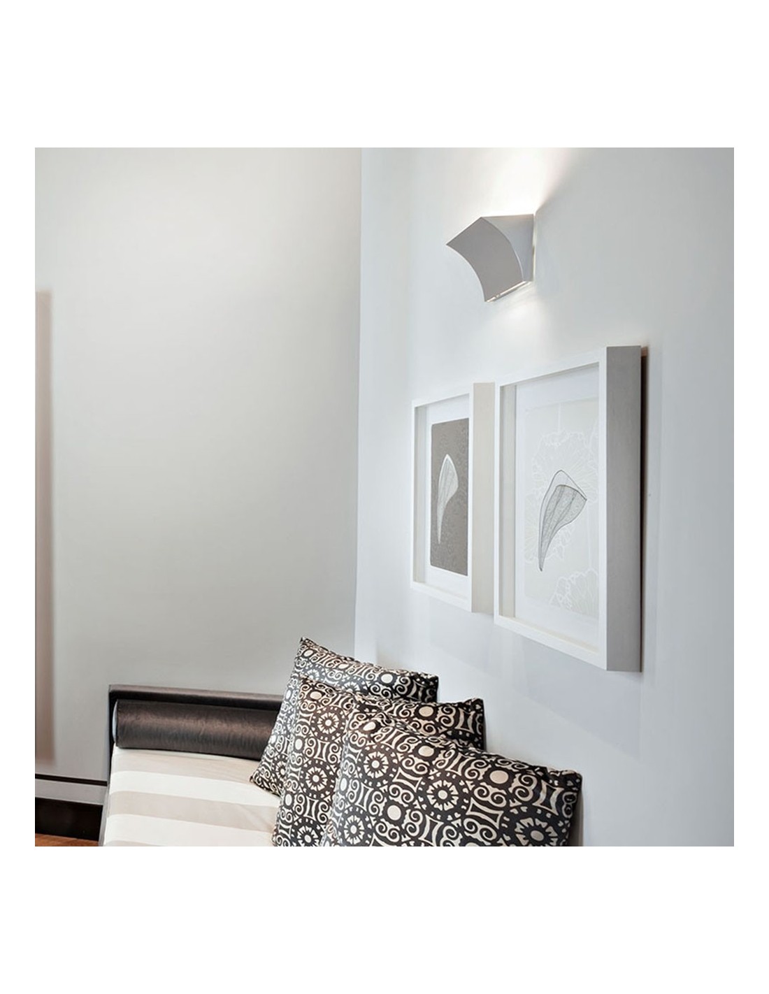 Lampada da parete a luce diretta/indiretta. Corpo in lega di zama pressofusa, verniciata a liquido nei colori grigio opaco, bianco lucido oppure con finitura cromata in galvanica. Attacco a parete in acciaio stampato e zincato bianco, riportante sia il sistema di fissaggio a parete, che i dispositivi elettrici.