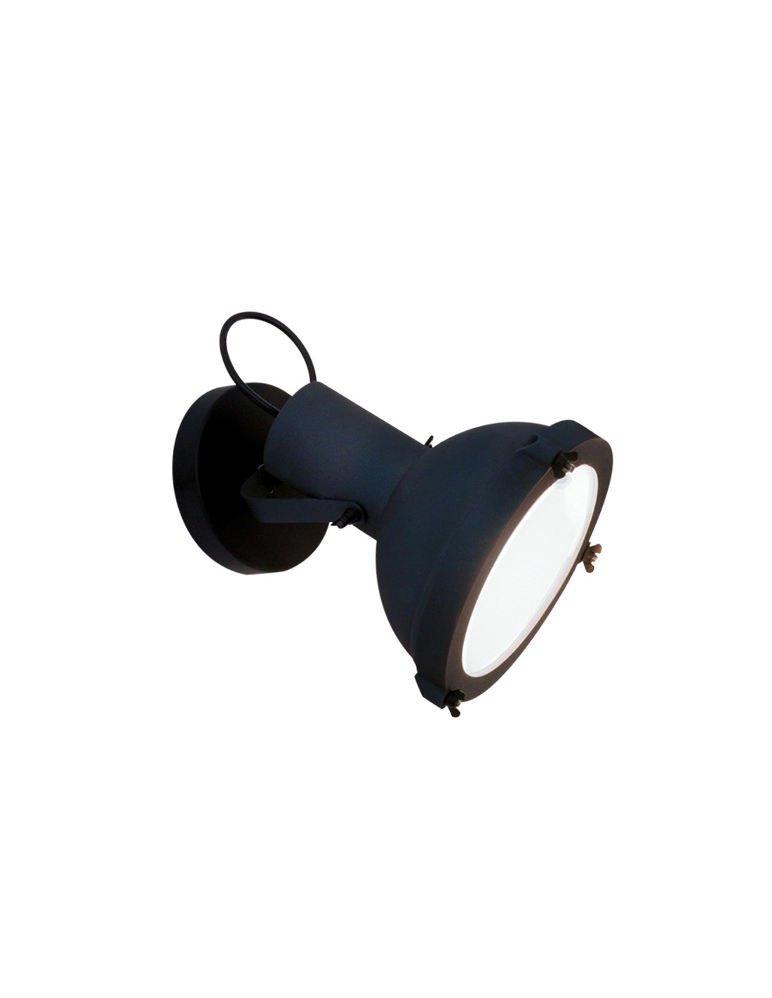Versione Mini orientabile del Projecteur 365. . Il corpo della lampada è in alluminio verniciato blu notte, bianco sabbiato moka. Il vetro diffusore è bombato e sabbiato internamente. La pinza e il rosone sono verniciati nero opaco, i galletti di chiusura sono cromati neri come il resto della minuteria. La lampada emette una luce diffusa e orientabile. L'attacco E27 permette l'utilizzo di sorgenti fluorescenti e LED.