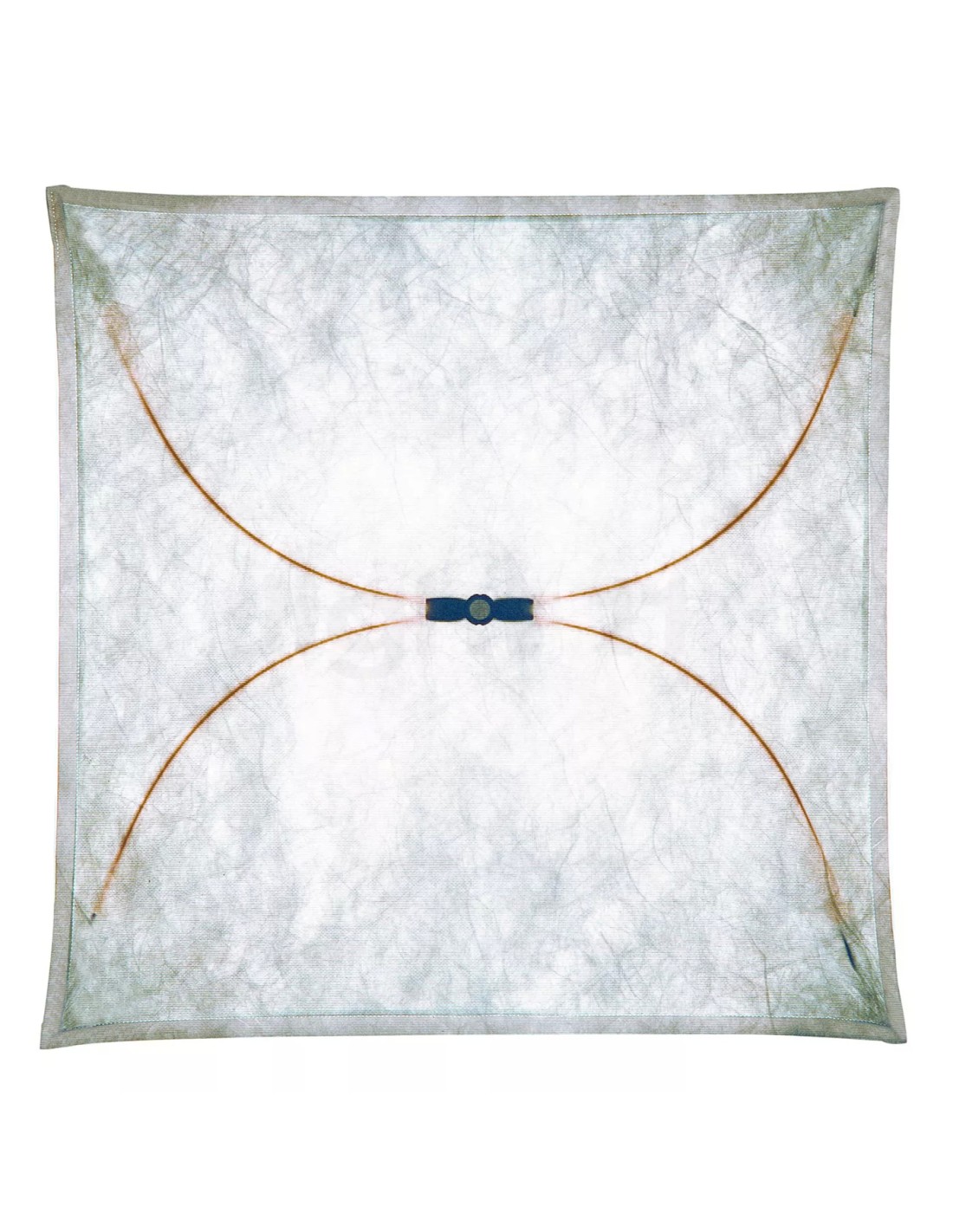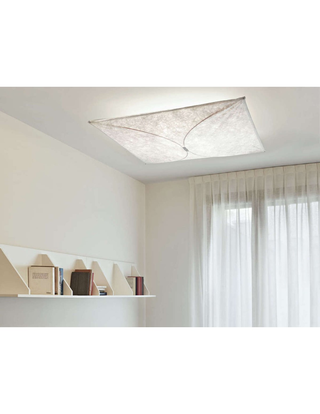 Il design unico combina una struttura metallica essenziale con un diffusore in tessuto sintetico che, una volta montato, crea una superficie tesa e luminosa. L'effetto è quello di una nuvola di luce che sembra fluttuare sulla parete.