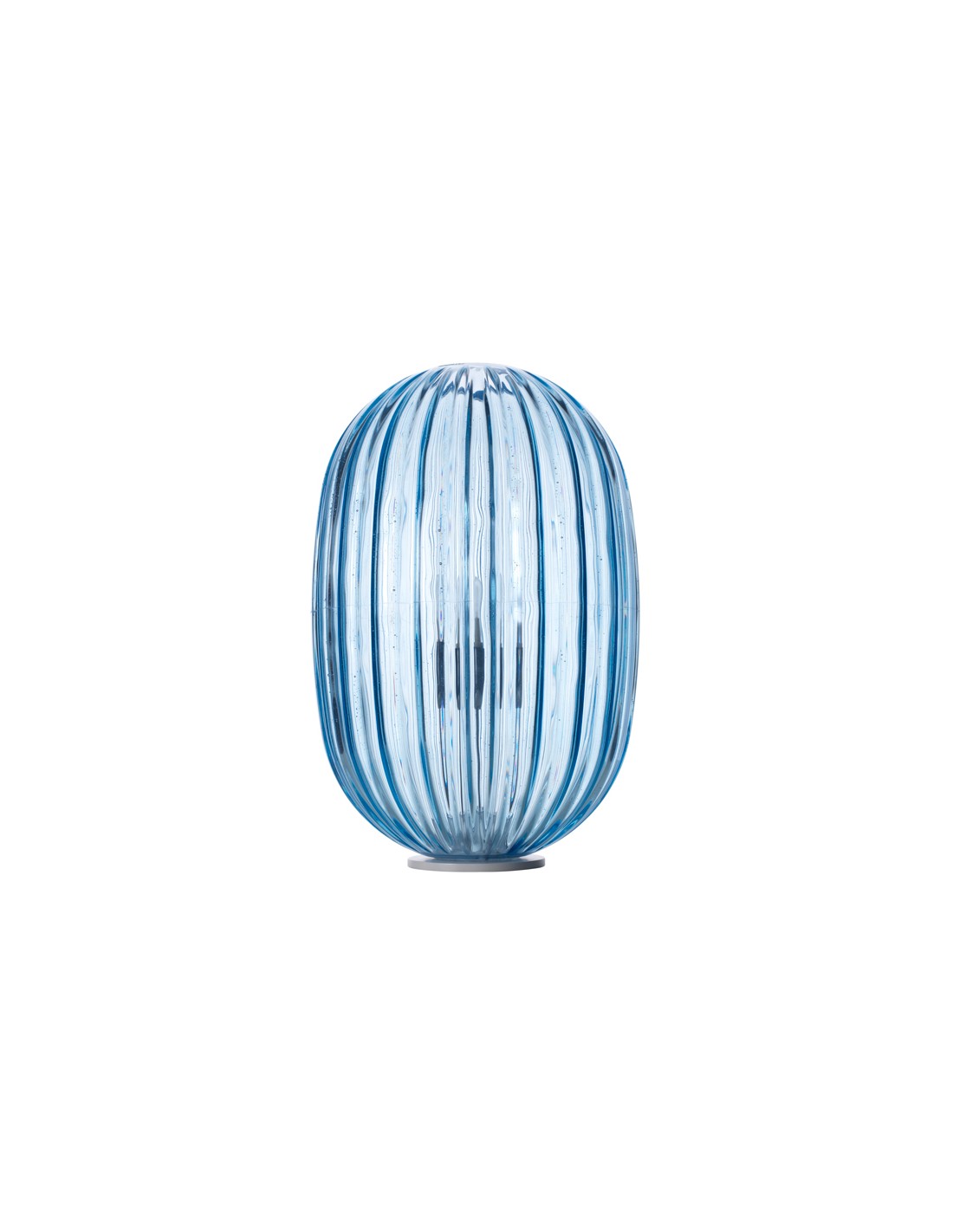 FoscariniLa lampada da tavolo Plass, con il suo design che ricorda una perla di vetro molato, crea un caleidoscopico effetto luminoso sul piano d’appoggio e nell’ambiente.