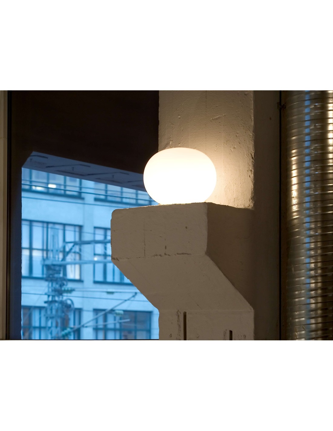 FlosLampada da tavolo a luce diffusa. Diffusore composto da un vetro opalino incamiciato, soffiato a bocca, con finitura esterna acidata e da una ghiera filettata in lega di alluminio pressofusa, con finitura galvanica "cromatazione alodine".
