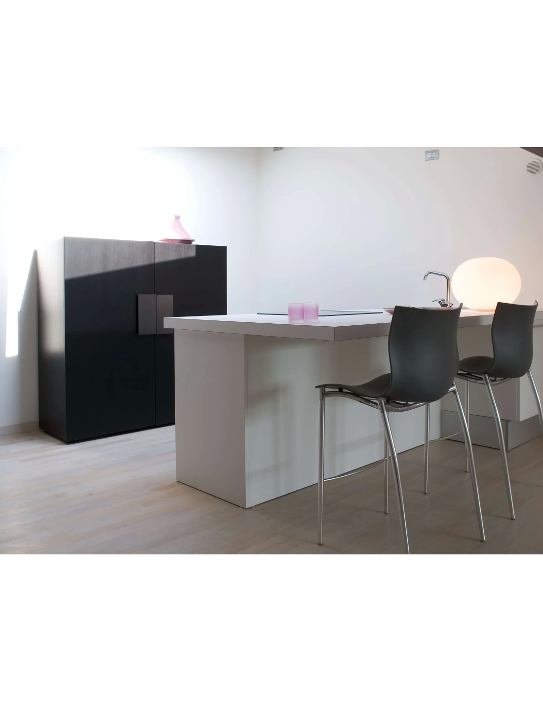FlosLampada da tavolo a luce diffusa. Diffusore composto da un vetro opalino incamiciato, soffiato a bocca, con finitura esterna acidata e da una ghiera filettata in lega di alluminio pressofusa, con finitura galvanica "cromatazione alodine".
