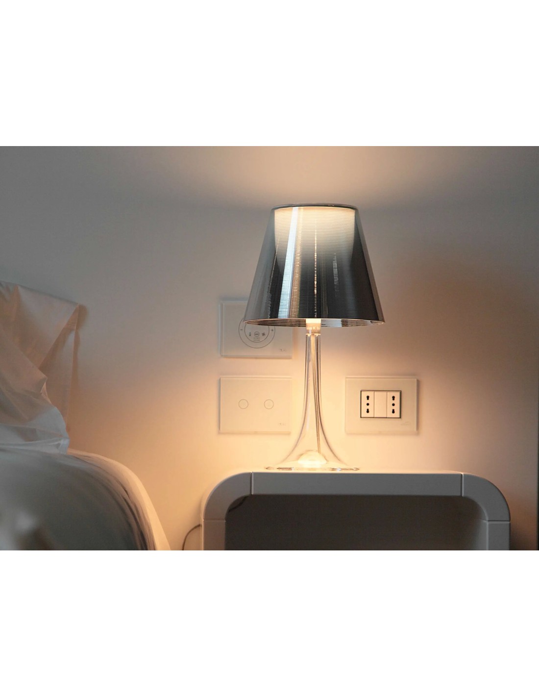 Apparecchio di illuminazione da tavolo a luce diffusa. Corpo in PMMA (polimetilmetacrilato) completamente trasparente stampato ad iniezione.