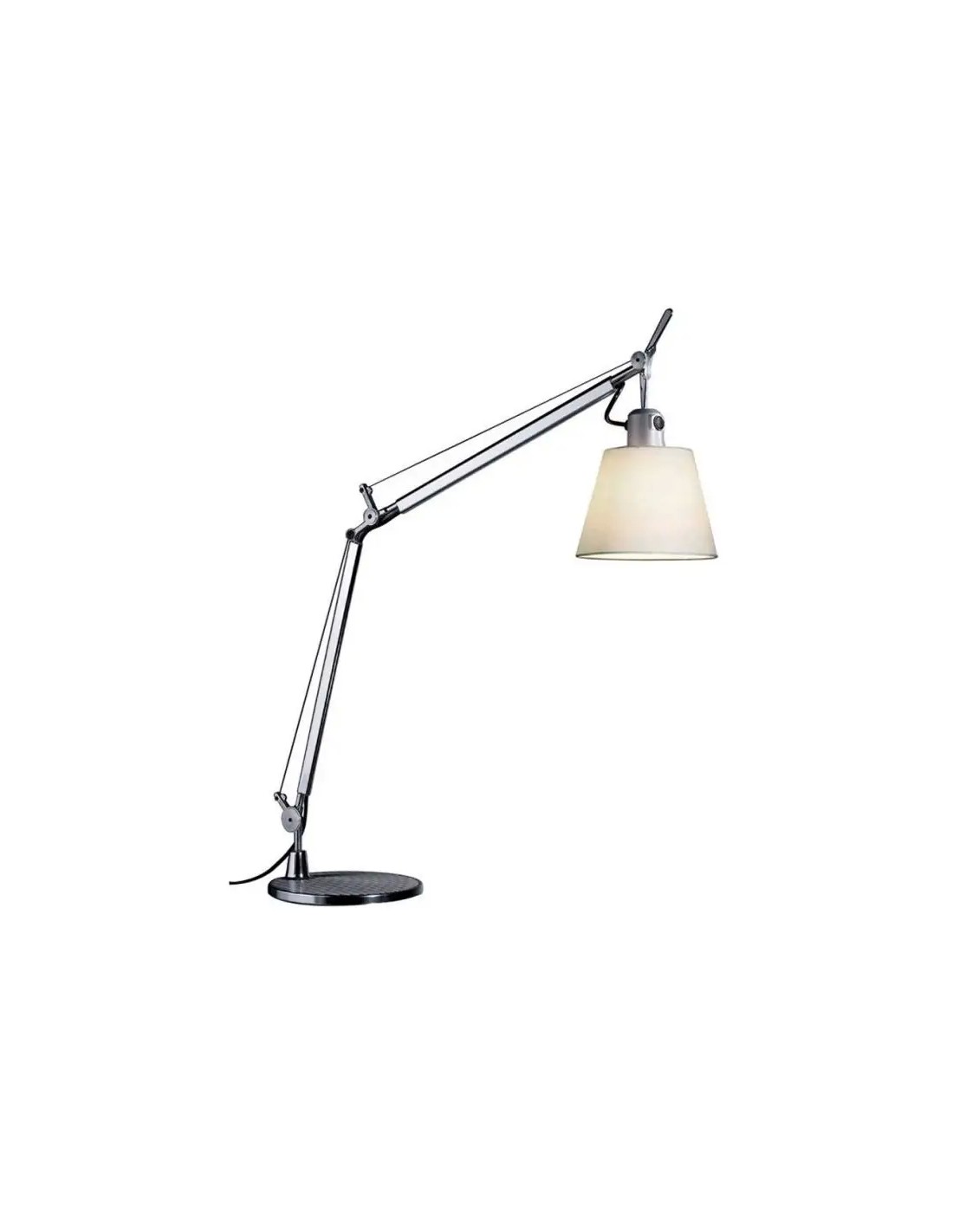 La lampada si distingue per il suo diffusore in pergamena naturale o in raso, che dona una luce calda e avvolgente, ideale per creare un'atmosfera accogliente in ambienti domestici o professionali. Il braccio regolabile in alluminio lucidato permette una facile gestione dell'orientamento della luce, assicurando un'illuminazione direzionale e personalizzabile in base alle necessità.