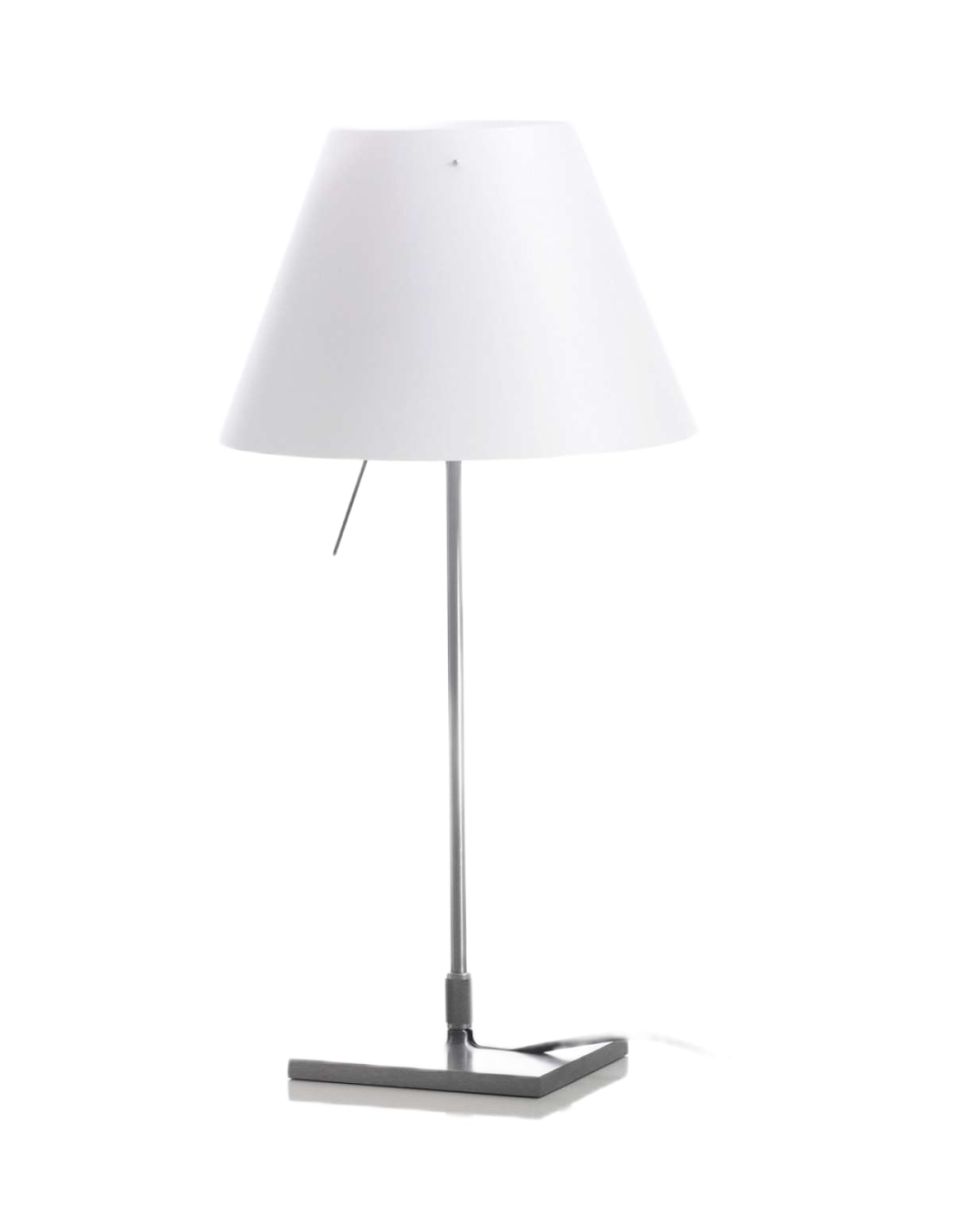 Una presenza tanto discreta quanto solida. Costanzina si inserisce con semplicità in ogni ambiente senza porre vincoli stilistici di accostamento. Il paralume di policarbonato appoggia alla struttura di alluminio su due soli punti d'equilibrio. Se urtato, oscilla senza cadere.