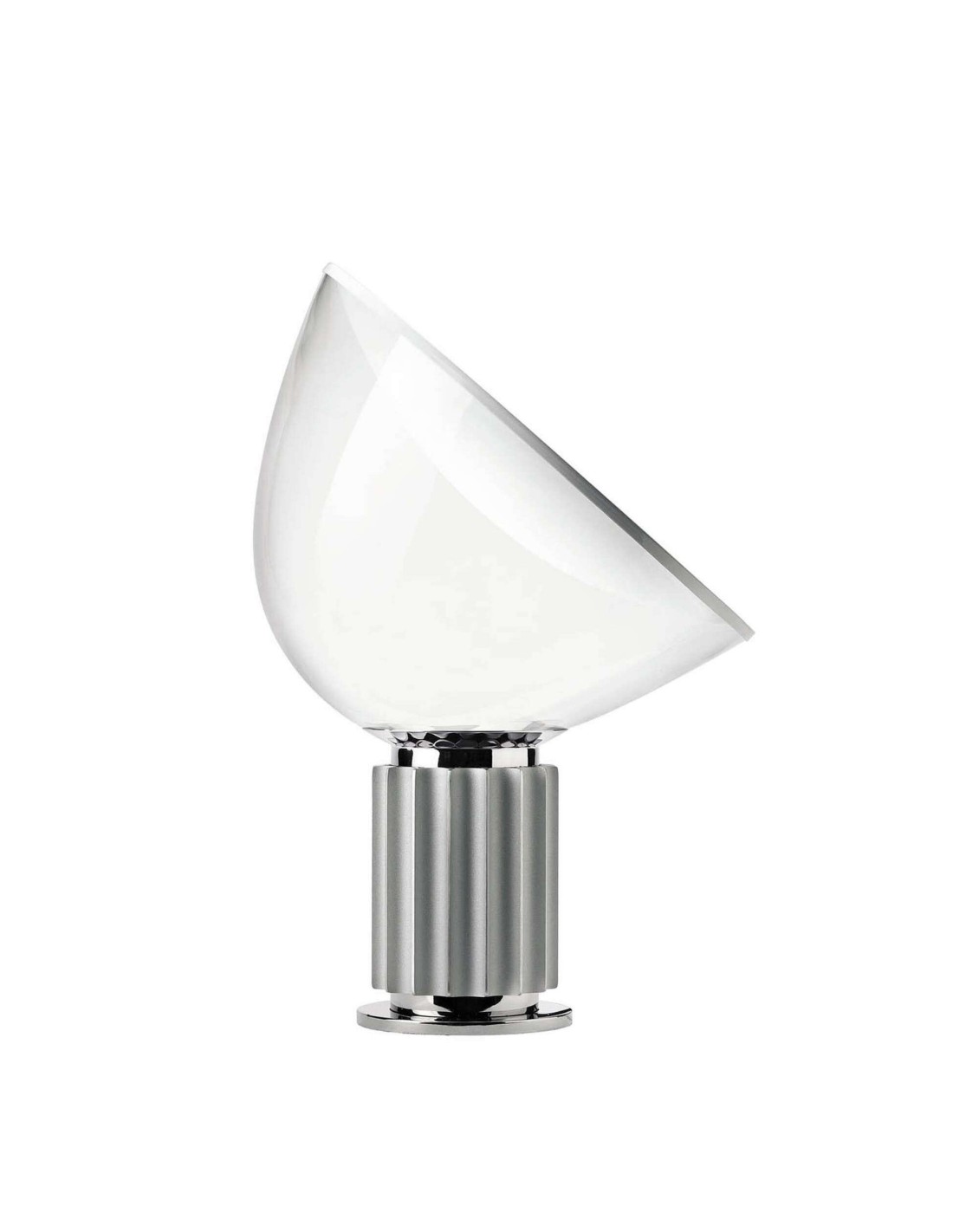 Progettata originariamente con l'idea di utilizzare materiali plastici che poi si rivelarono inadatti al calore delle lampadine dell'epoca, la Taccia è stata consacrata al successo grazie all'uso del vetro soffiato. La sua forma è un'illusione ottica: sembra una lampada a sospensione capovolta, dove la base funge da supporto e allo stesso tempo da elemento dissipatore di calore. Il riflettore in alluminio bianco, appoggiato sulla campana, proietta la luce verso il basso, creando un'illuminazione indiretta, morbida e perfettamente diffusa.