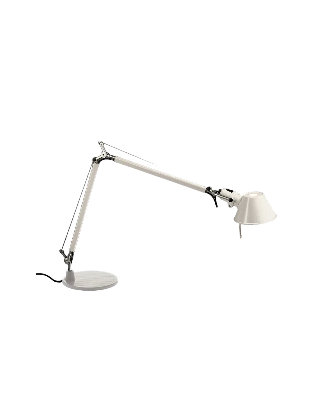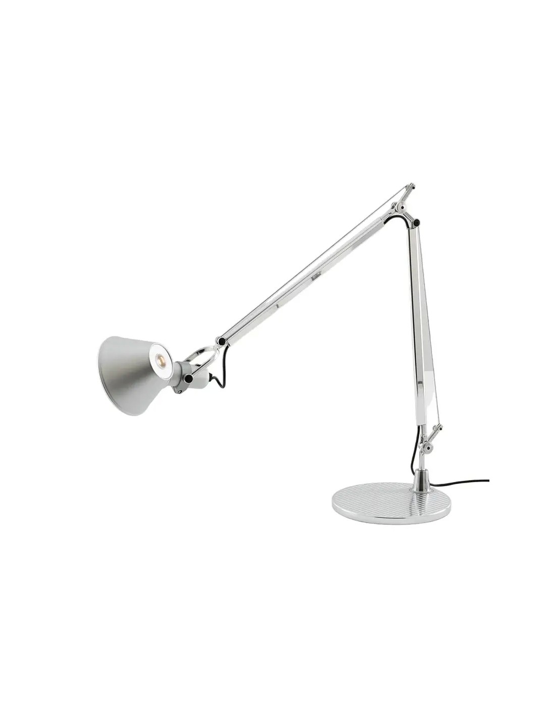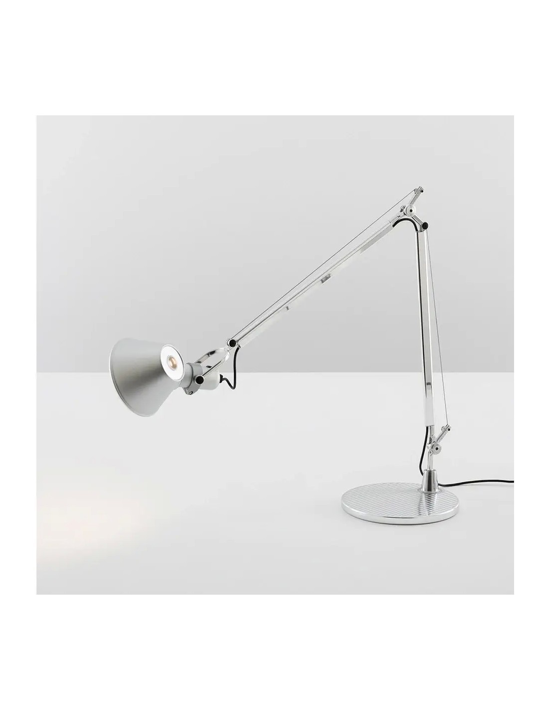 Il diffusore, realizzato in alluminio anodizzato opaco, è orientabile in tutte le direzioni e presenta un piccolo foro superiore che permette una leggera emissione di luce verso l'alto, evitando contrasti netti nell'ambiente. La struttura a bracci mobili in alluminio lucidato garantisce un'ampia escursione, rendendola perfetta per illuminare grandi piani di lavoro. Che sia configurata con la classica base circolare, con il morsetto o con il supporto fisso, la Tolomeo originale Artemide si conferma come uno strumento di lavoro indispensabile e un pezzo d'arredamento di ineguagliabile eleganza.