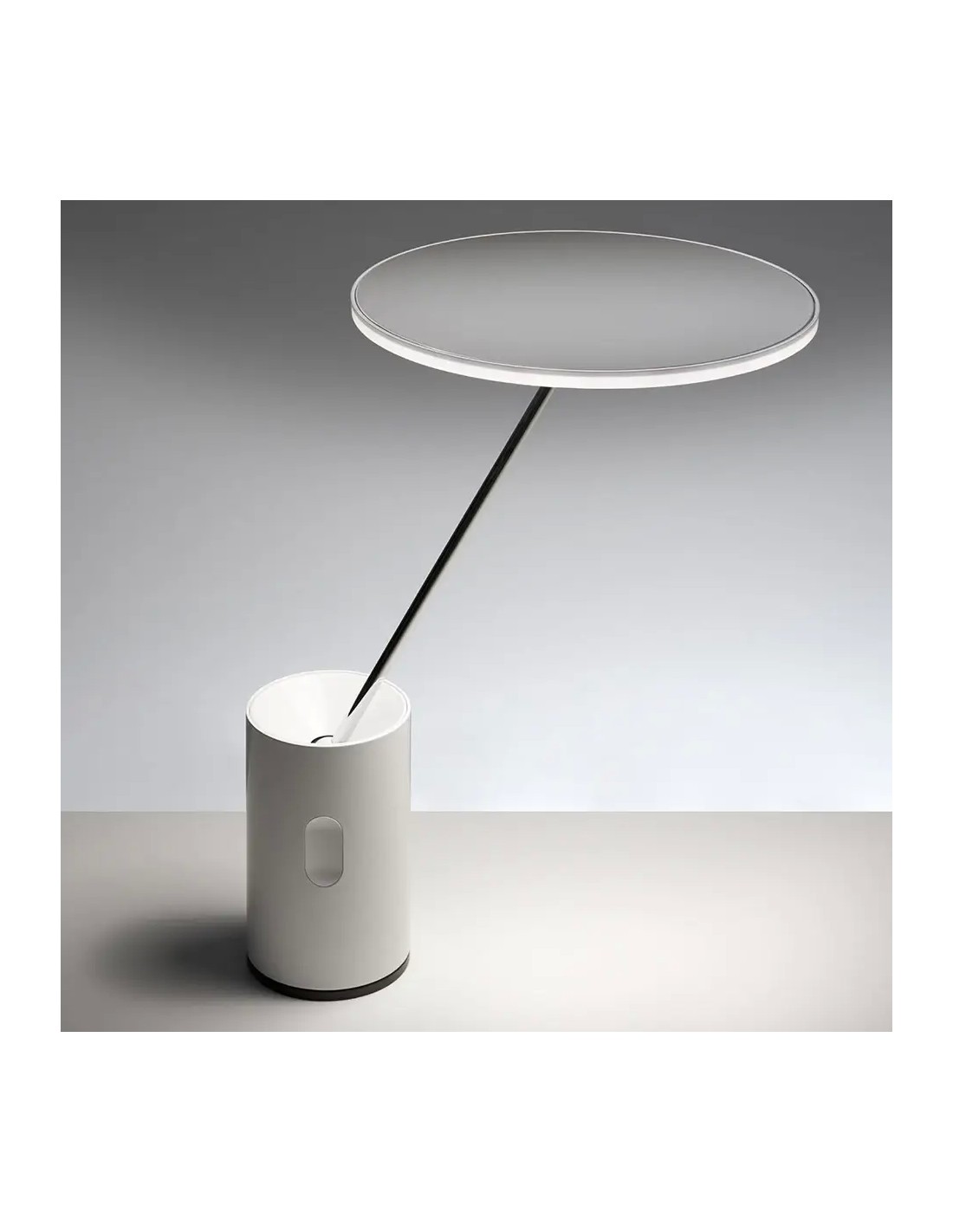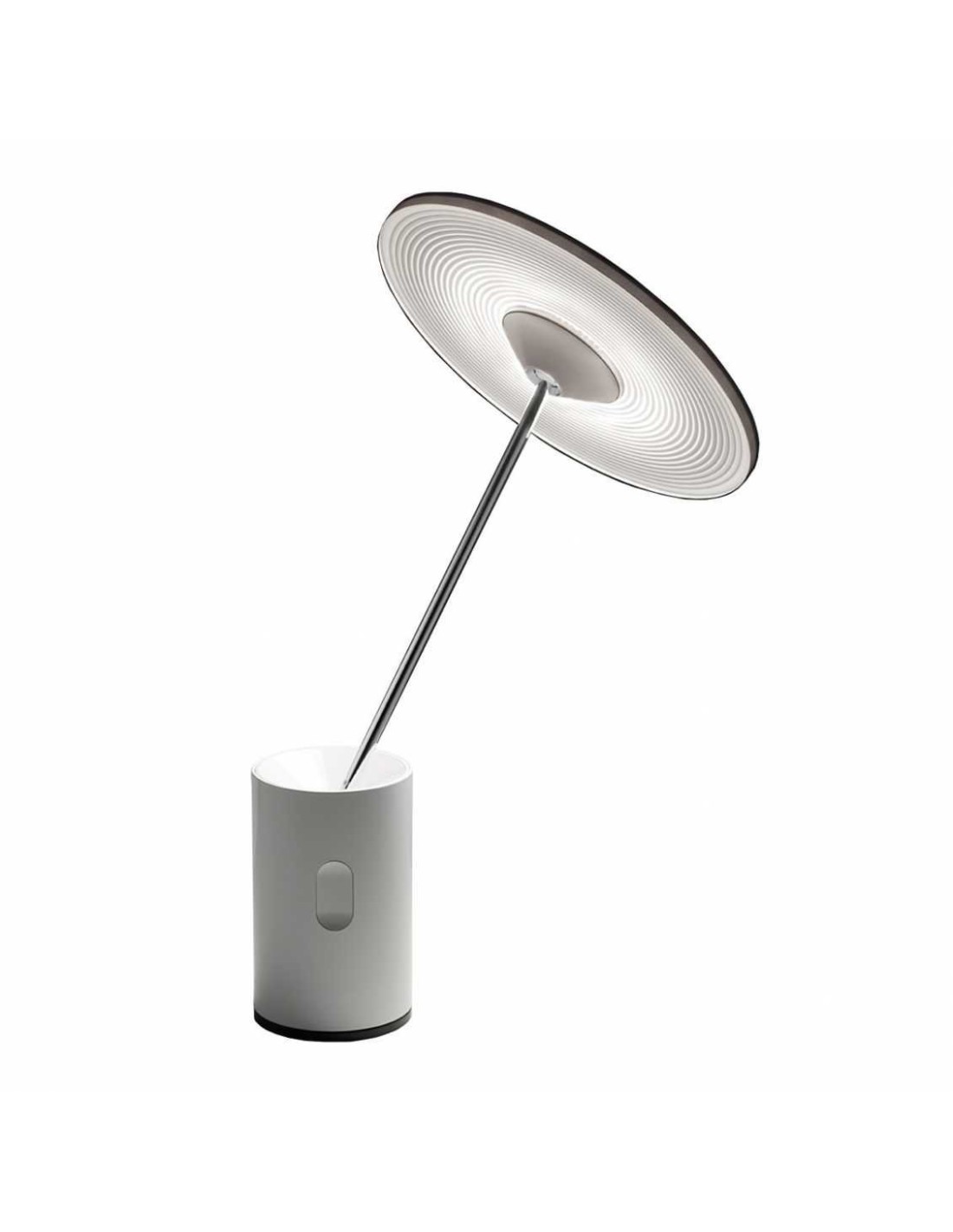 Lampada da tavolo che bilancia comfort visivo ed esigenze di illuminazione dell'ambiente. Materiali: la testa e la base cilindrica sono in alluminio estruso, lo stelo orientabile è in ottone cromato e il diffusore in PMMA. Specificità: lo snodo sferico centrale permette di orientare la luce con la massima libertà e il minimo ingombro della base, garantendo un corretto illuminamento sia su piani di lavoro estesi che su superfici più ridotte. Il diffusore piatto orientabile si inclina in tutte le direzioni ed emette luce LED calda e rilassante.