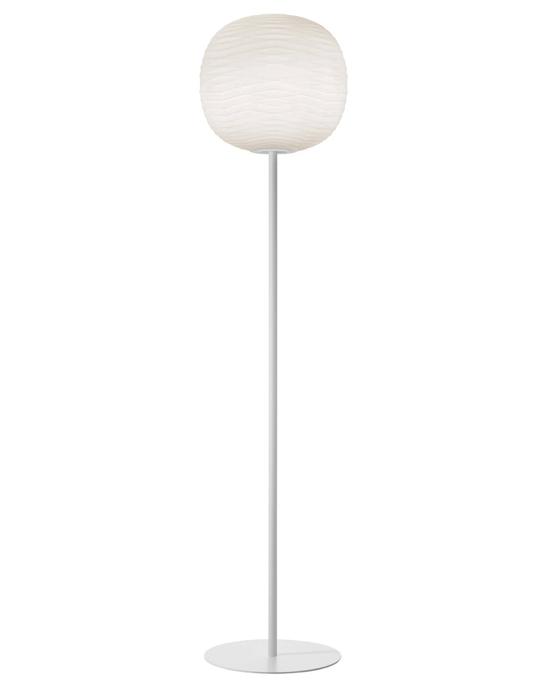 Il vetro di Gem dichiara a prima vista la preziosità del materiale: ha un pattern grafico caratterizzato da onde che si rincorrono sulla sua superficie e rendono la lampada inconfondibile anche da spenta.