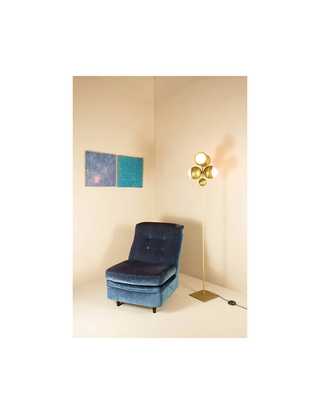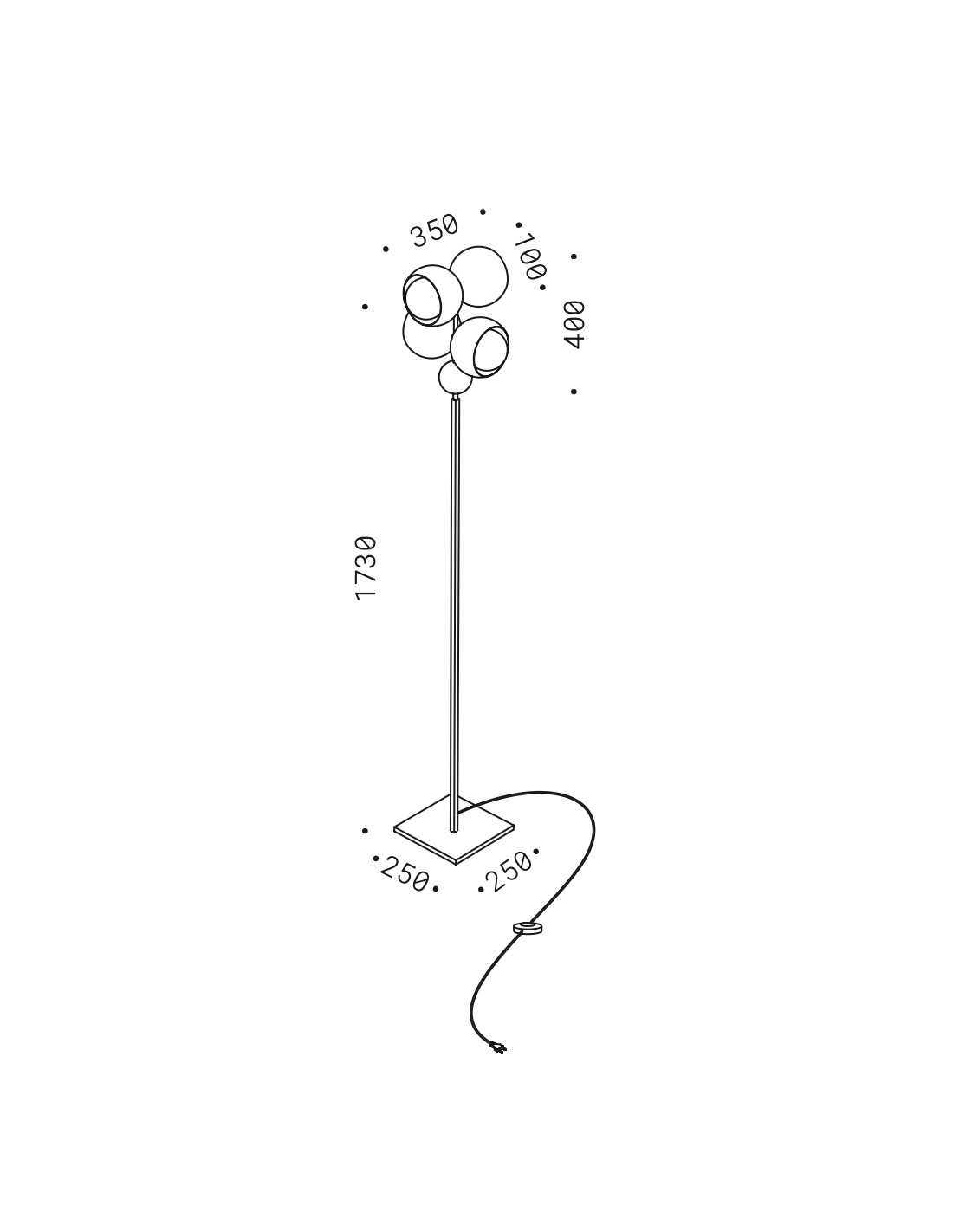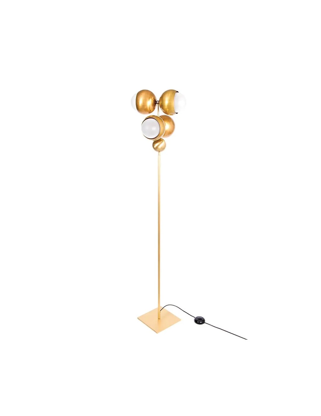Corpo in ottone naturale, vetri decorativi satinati, lampadine LED incluse, sfere decorative in ottone, dimmer passacavo.