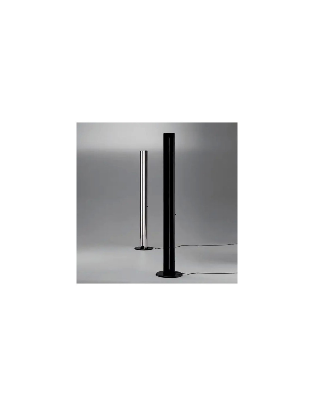 Piantana di design realizzata con struttura in alluminio verniciato disponibile nelle finiture nero lucido o alluminio lucido e diffusore in termoplastica. Lampada dal design innovativo ed essenziale, un asta doppia in alluminio contenente la sorgente led nel mezzo che combinata alle sue finiture lucide regala un tocco di design all'ambiente in cui la si colloca.