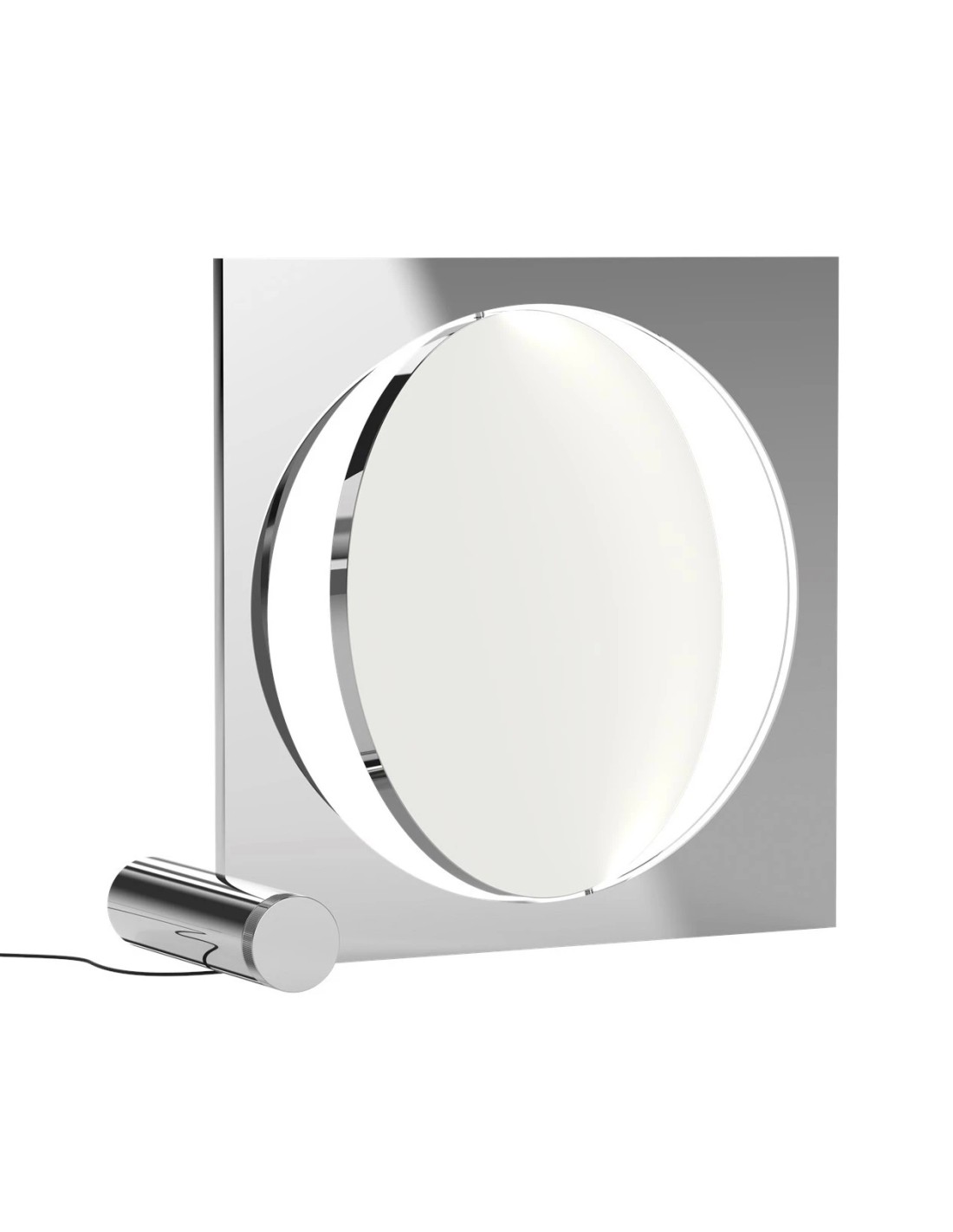 Orientata verso il lato bianco, la luce diventa morbida e diffusa, mentre il lato opposto cromato riflette direttamente il pannello luminoso per creare un’espressione totalmente diversa. La luce è diretta in base alla posizione del disco. L'ambiente circostante si rispecchia nel telaio e nel lato cromato del disco. La lampada offre una regolazione continua e si accende e si spegne con l'interruttore a pedale rotante posizionato sul cilindro.
