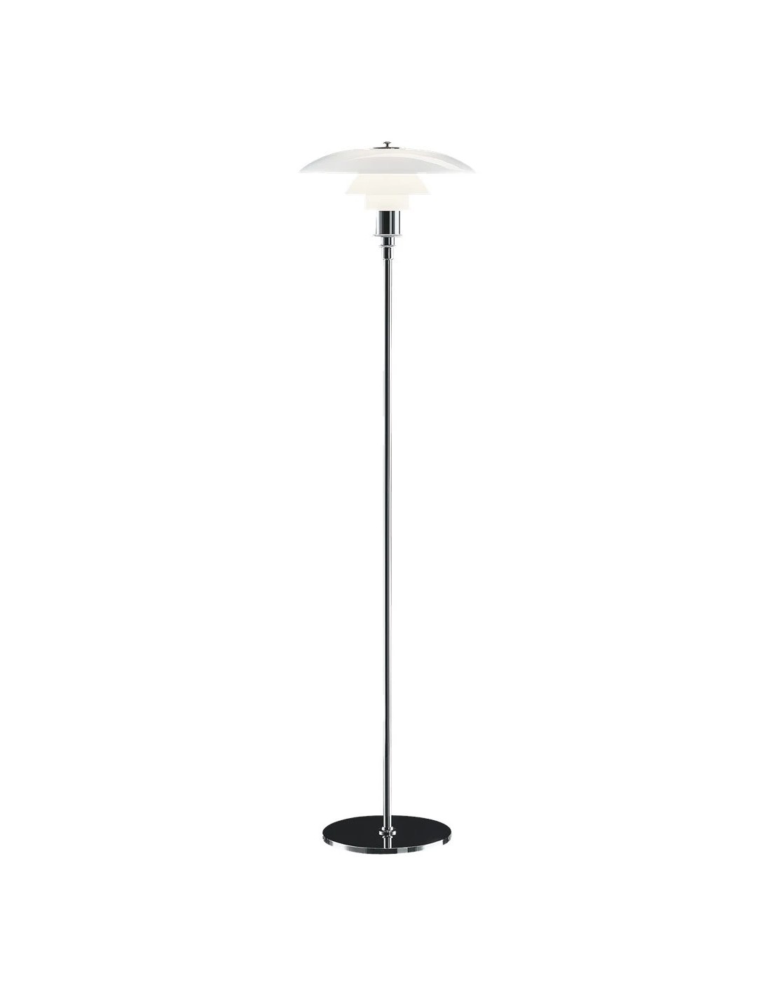 L’apparecchio è stato progettato secondo il principio dei tre schermi riflettenti che dirigono la maggior parte della luce verso il basso. Gli schermi sono realizzati in vetro opalino soffiato a tre strati, lucido nella parte superiore e sabbiato opaco nella parte inferiore in modo tale da distribuire una luce morbida e diffusa.