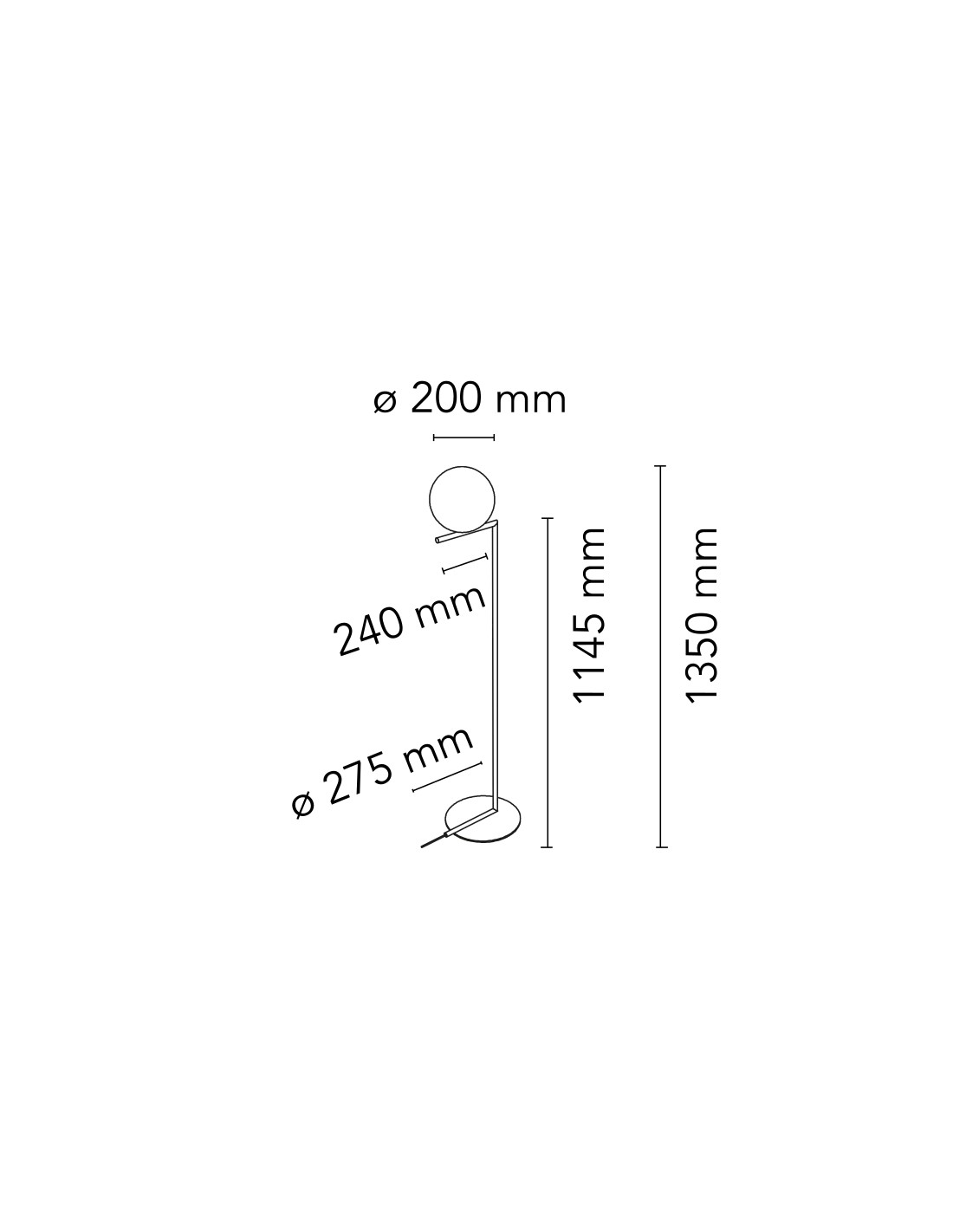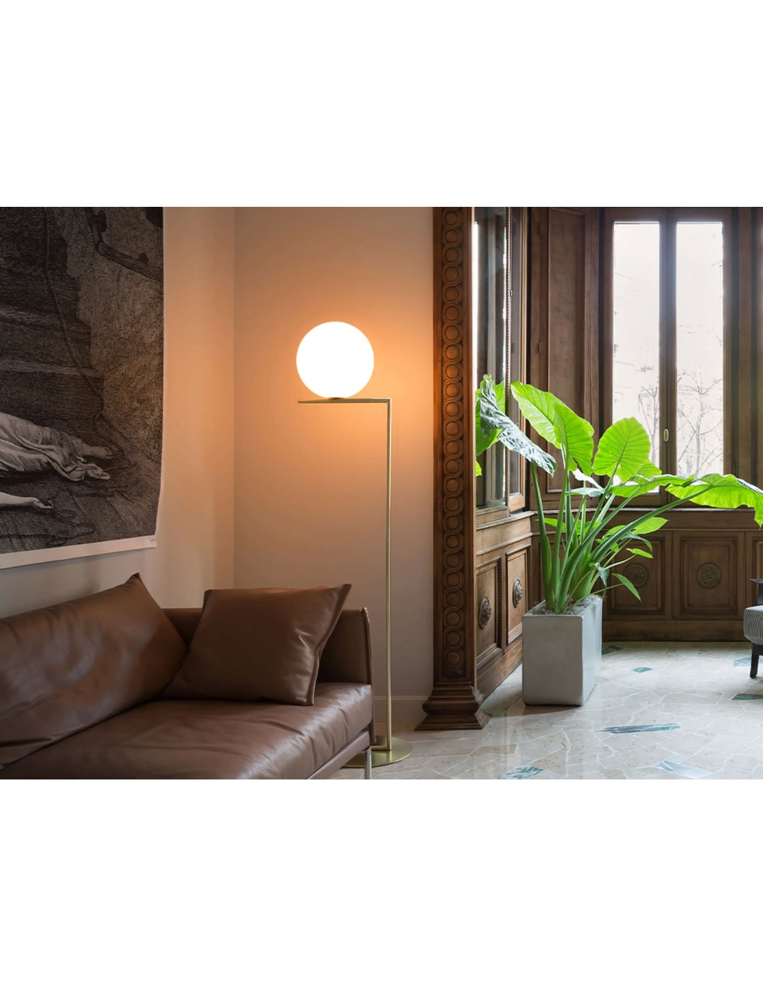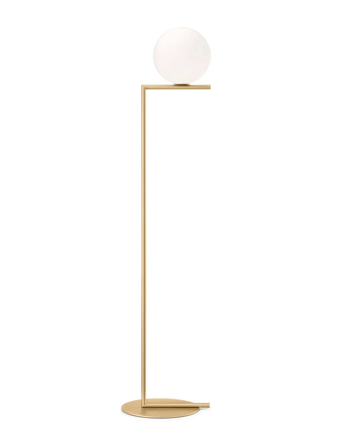 Apparecchio di illuminazione da terra a luce diffusa. Telaio in ottone, spazzolato e verniciato trasparente o acciaio cromato. Diffusore opalino di vetro soffiato. Dimmer presente sul cavo di alimentazione.