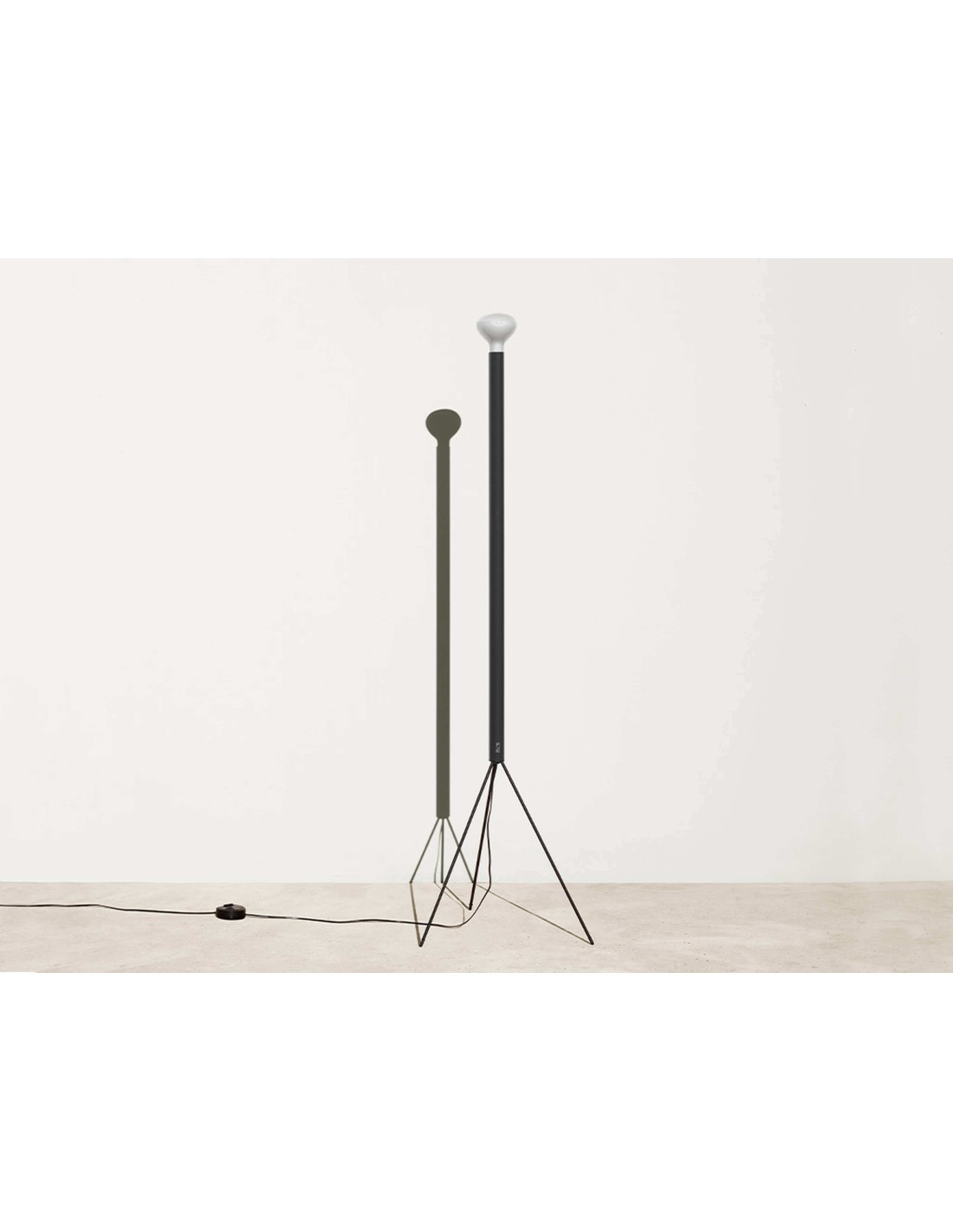 FlosLampada da terra a luce indiretta. Lampadina con riflettore. Stelo di ferro verniciato a liquido. Gambe in metallo zincato verniciate a liquido.