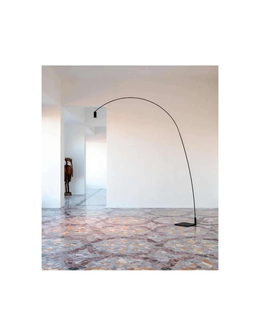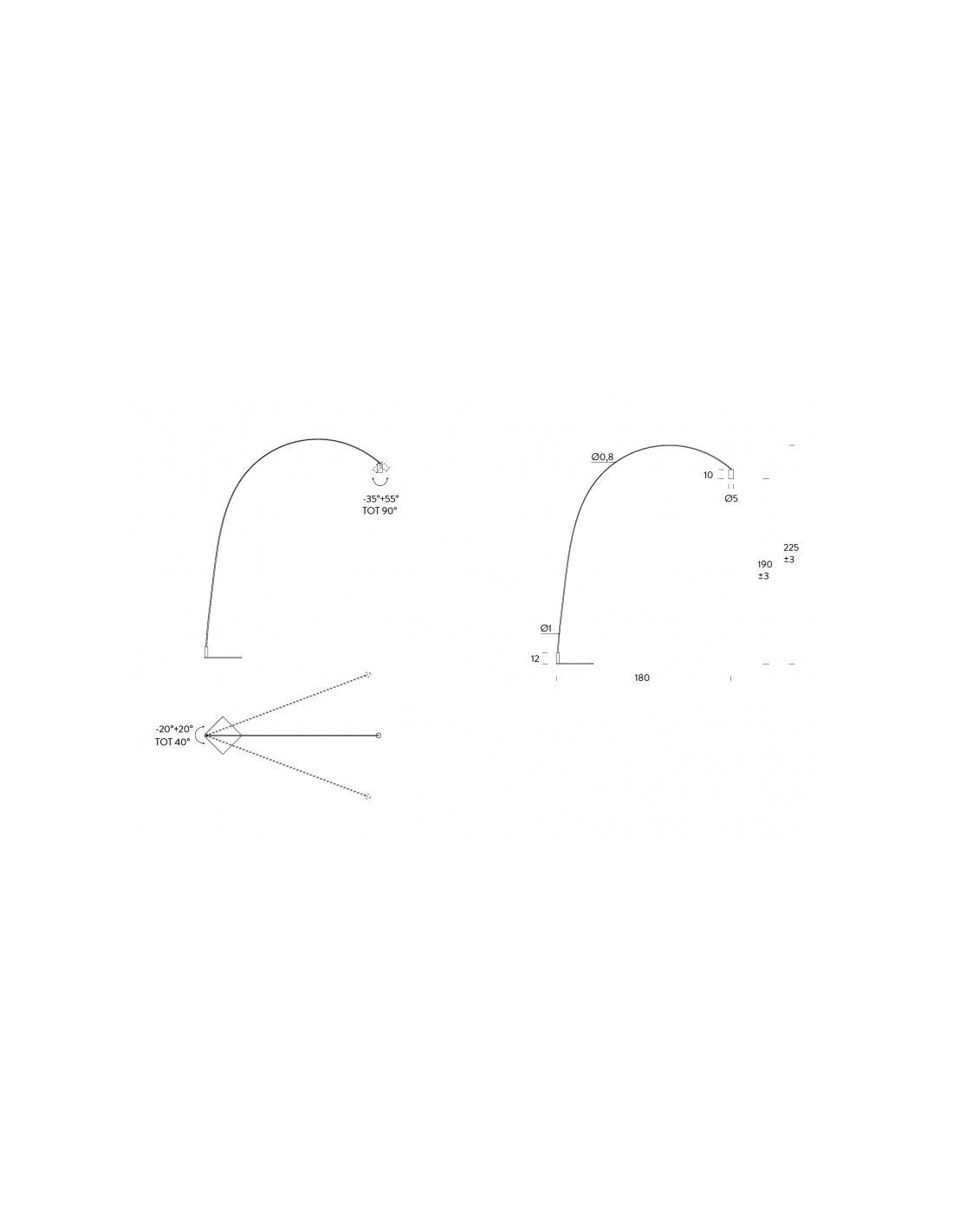 L’arco orientabile in acciaio verniciato nero opaco consente ampi movimenti, consentendo di interagire e allo stesso tempo decorare lo spazio. Lo spot cilindrico, con filtro antiriflesso opzionale, permette di orientare la luce in base all’esigenza. Il fascio di luce è caldo e diffuso.