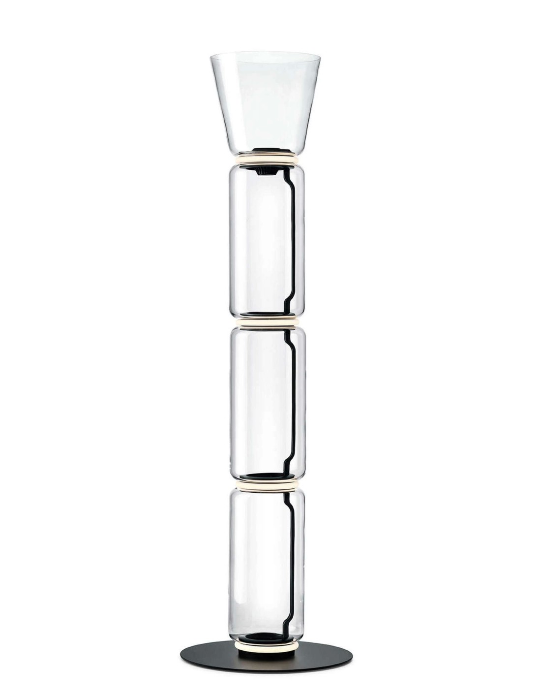 FlosLampade da terra composta da moduli in vetro che si connettono fra loro cosi da raggiungere un'altezza di 2,17 metri (85.43"). Corpo cilindrico e semisfera in vetro soffiato trasparente, base e anelli in alluminio pressofuso, bracci laterali interni in acciaio idroformato.
