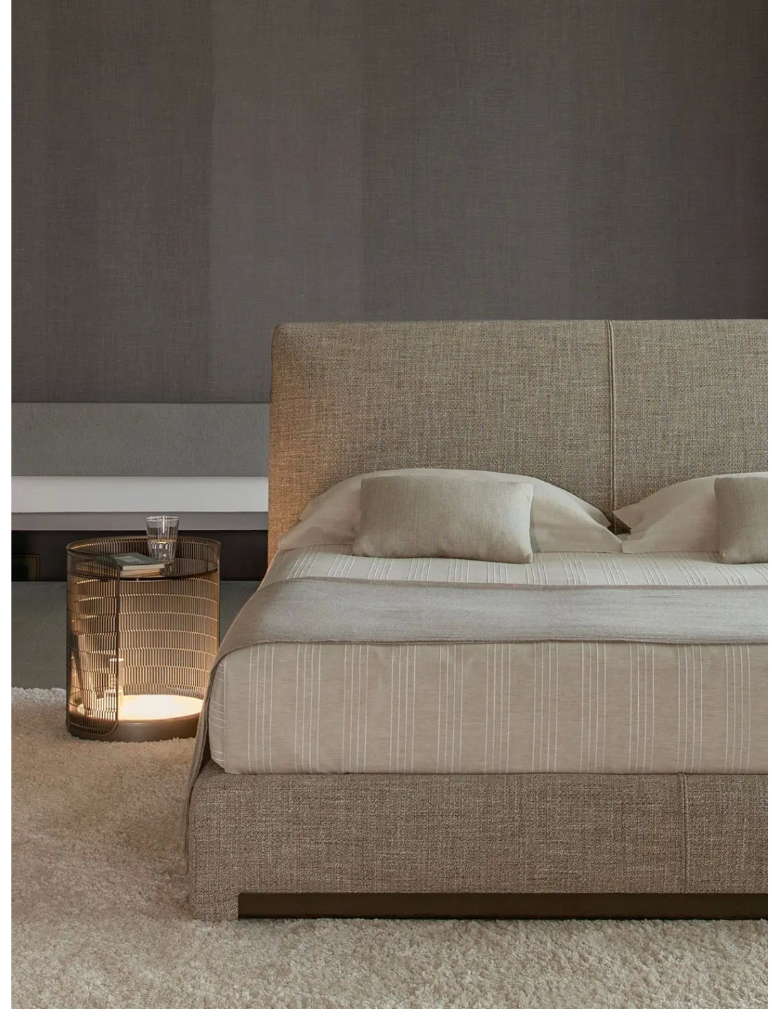 Il letto AtelierM rompe gli schemi del classico letto imbottito introducendo elementi materici industriali in un contesto di comfort assoluto. Il progetto di Gino Moschetti si focalizza sul giroletto, dove un profilo in lamiera piegata non solo struttura la base, ma ne definisce l'identità estetica. Questo dettaglio metallico incastonato corre lungo il perimetro e si interrompe in corrispondenza degli angoli, mettendo in risalto la struttura interna e il logo Flou, inciso con precisione laser sulla parte anteriore per certificarne l'originalità e il prestigio.