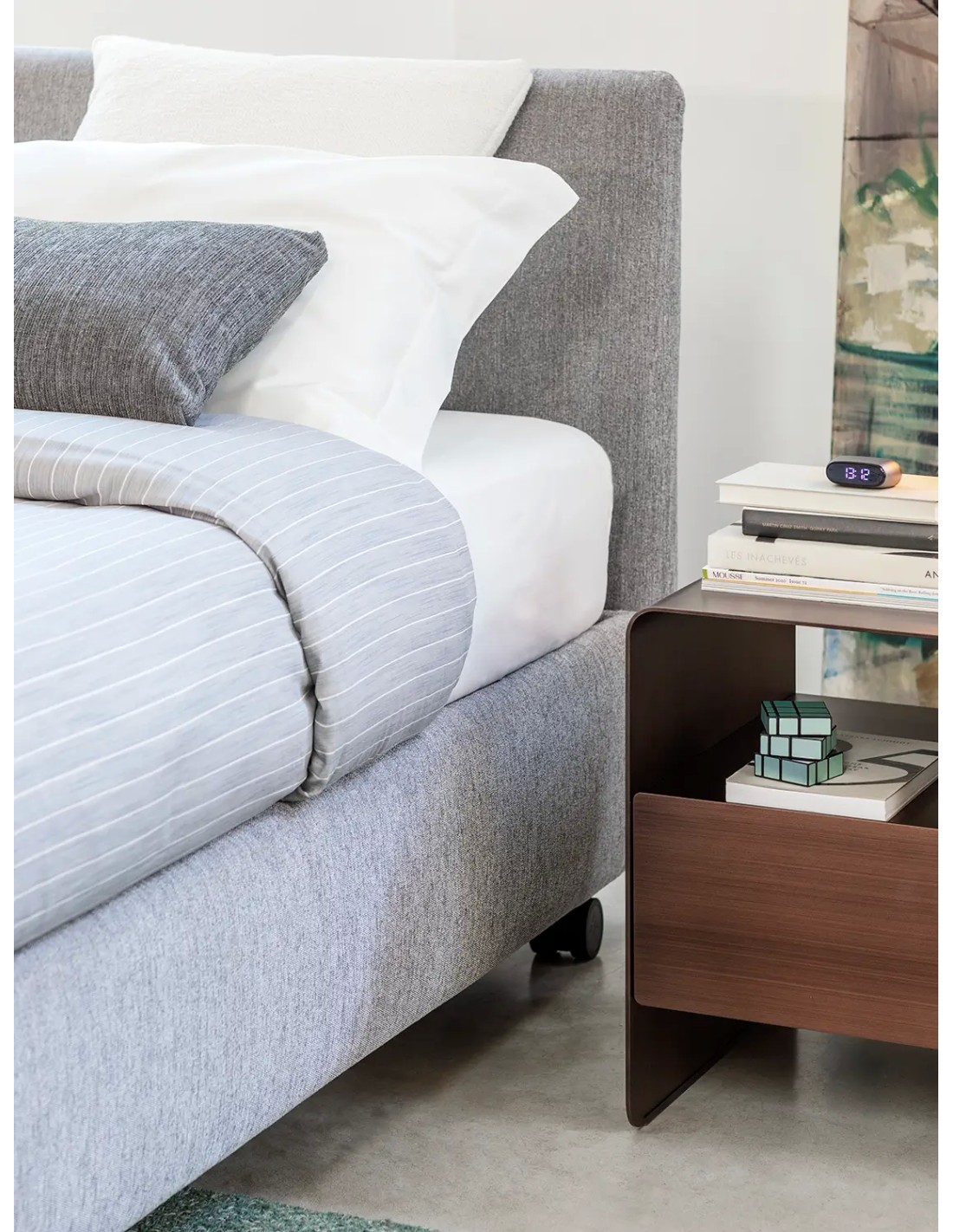 Il letto Notturno è un pilastro della collezione Flou che punta tutto sulla sobrietà e sulla razionalità delle forme. Vittorio Prato ha eliminato ogni decoro superfluo per concentrarsi su una struttura sottile e geometrica. La testata, perfettamente squadrata e imbottita, offre un supporto confortevole pur mantenendo uno spessore contenuto. È il letto di design ideale per chi desidera arredare la camera con discrezione, lasciando che siano la qualità del tessuto e la purezza delle linee a parlare.