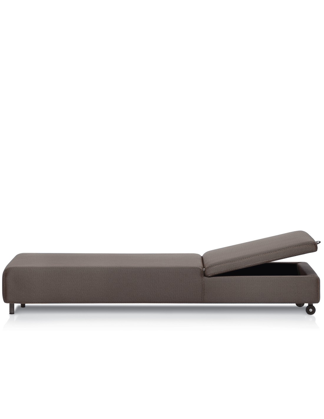 Pensato all'insegna del massimo comfort, il lettino ha dimensioni generose, è dotato di comode ruote per essere liberamente spostato e di uno schienale reclinabile in tre posizioni che nasconde un utile vano porta oggetti.