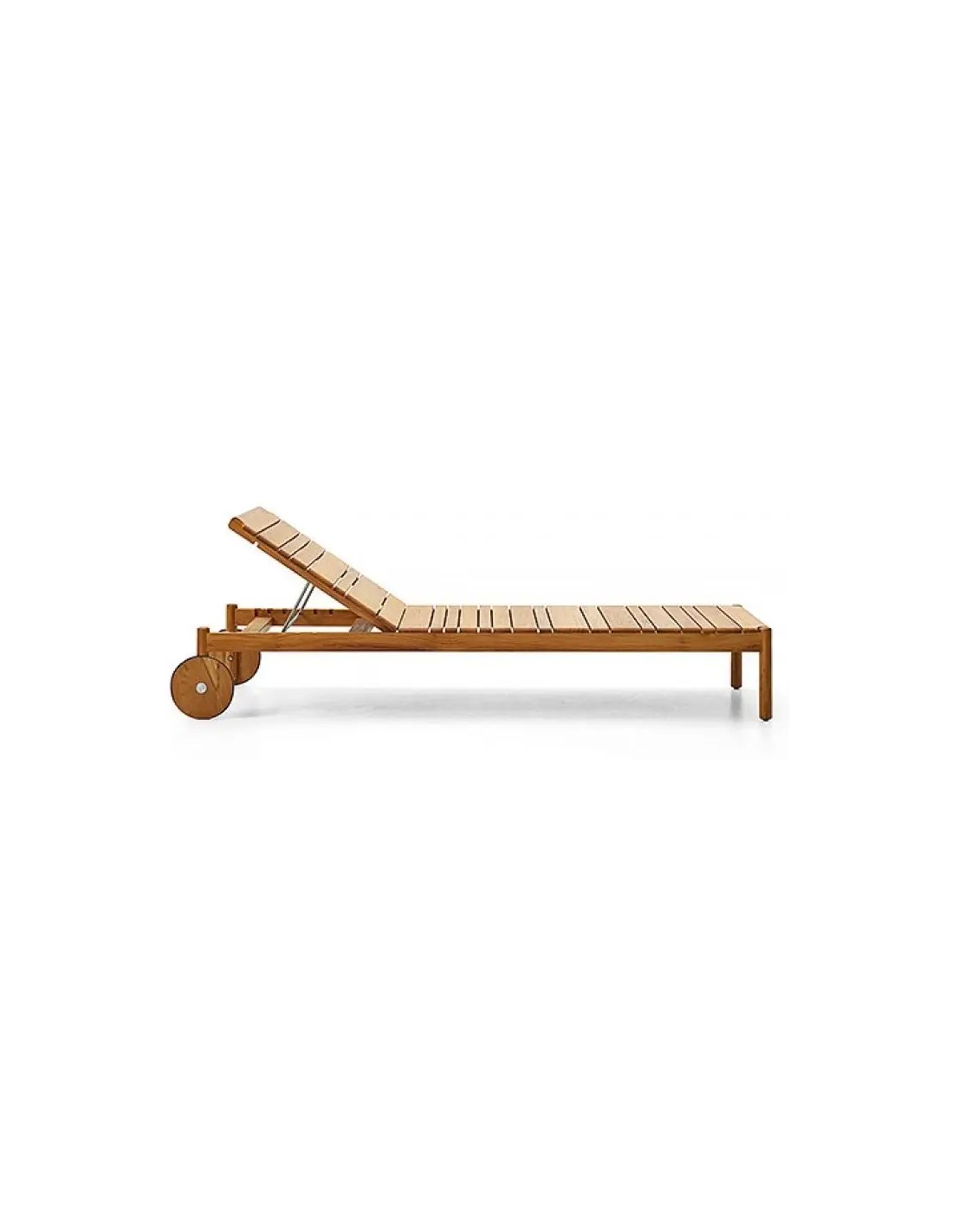 Le doghe in legno di teak si alternano con profondità differenti, creando un effetto "barcode". Perfetto per rilassarsi a bordo piscina, su una terrazza panoramica o nel giardino di casa, questo prendisole ha uno schienale regolabile in quattro posizioni, è dotato di ruote che ne facilitano gli spostamenti e può essere corredato da morbide cuscinature rivestite con tessuti resistenti alle intemperie.